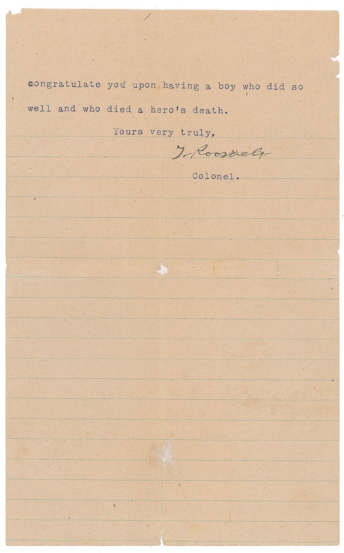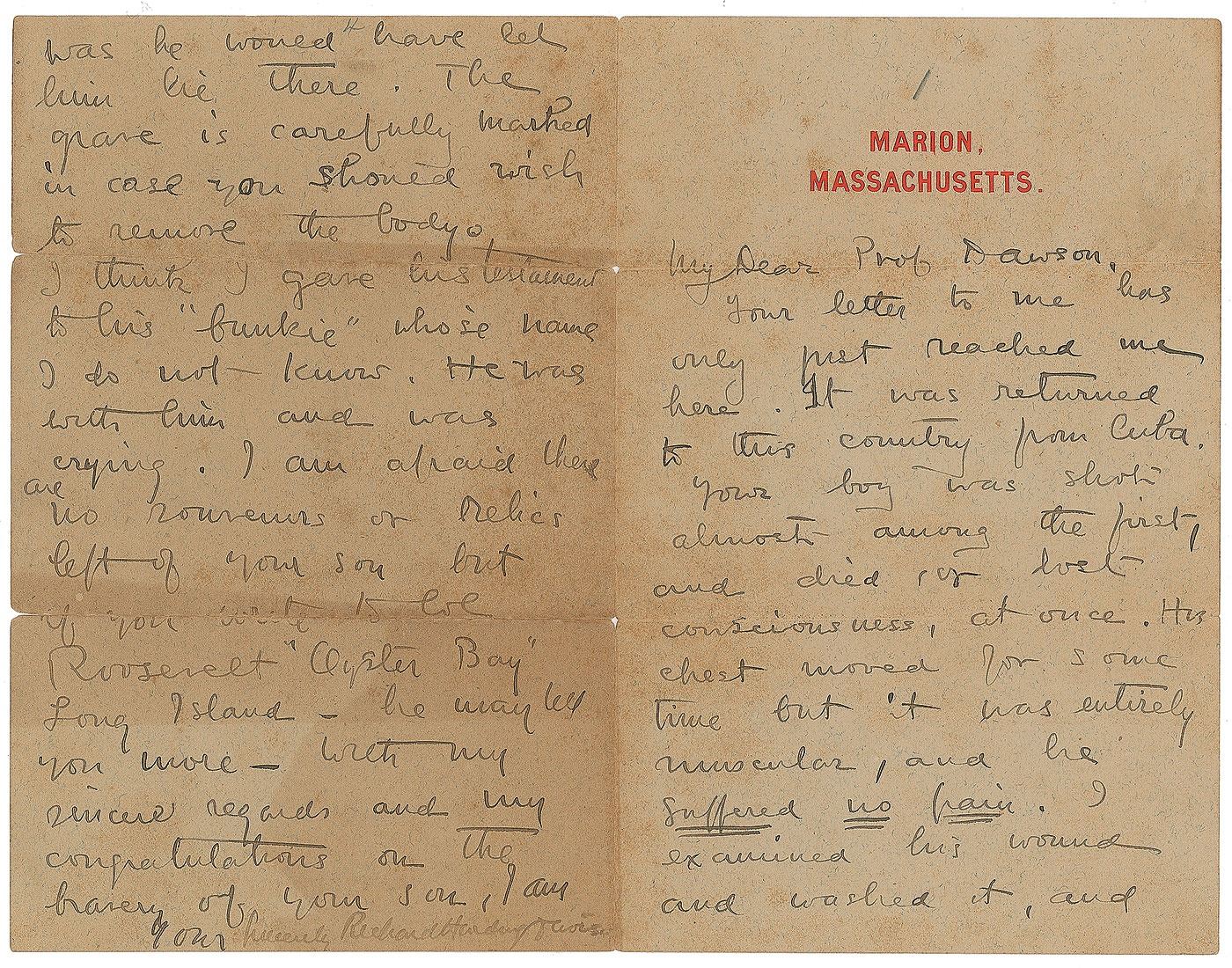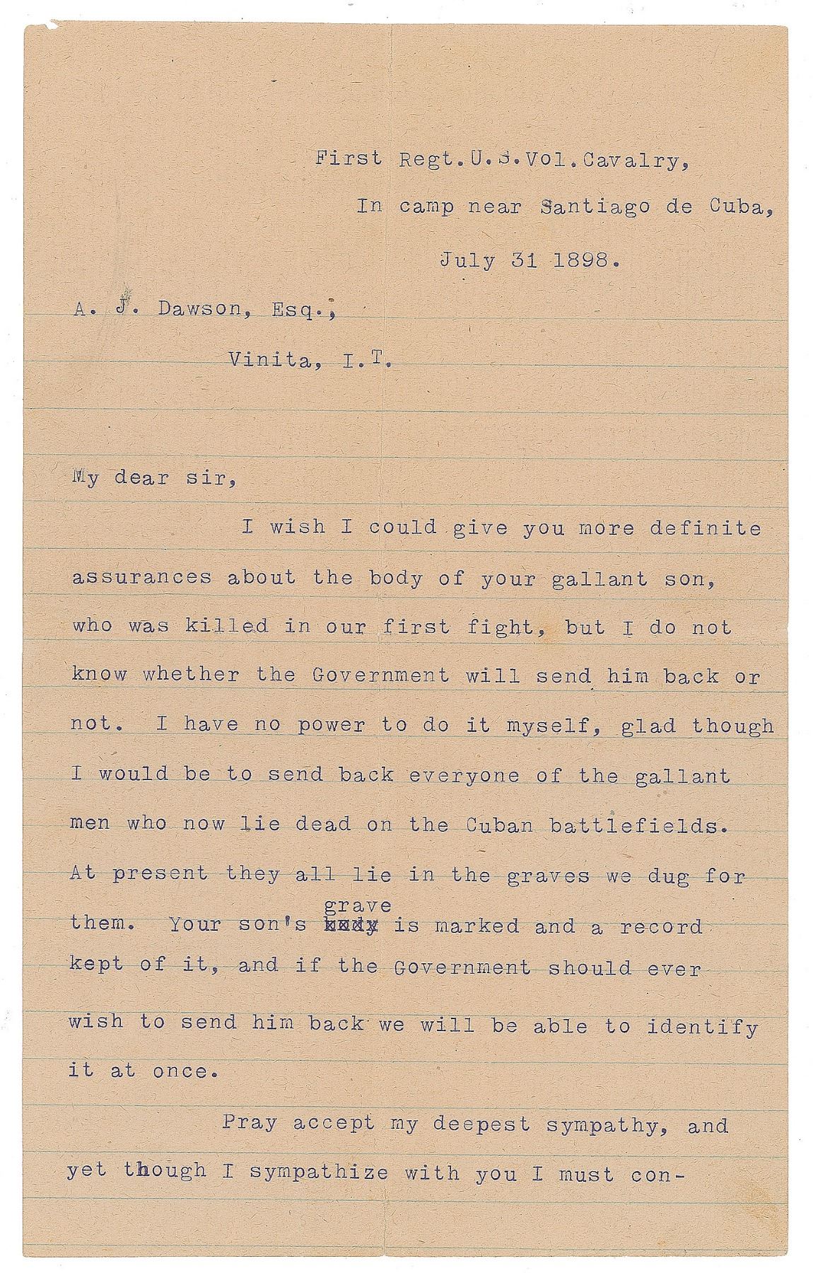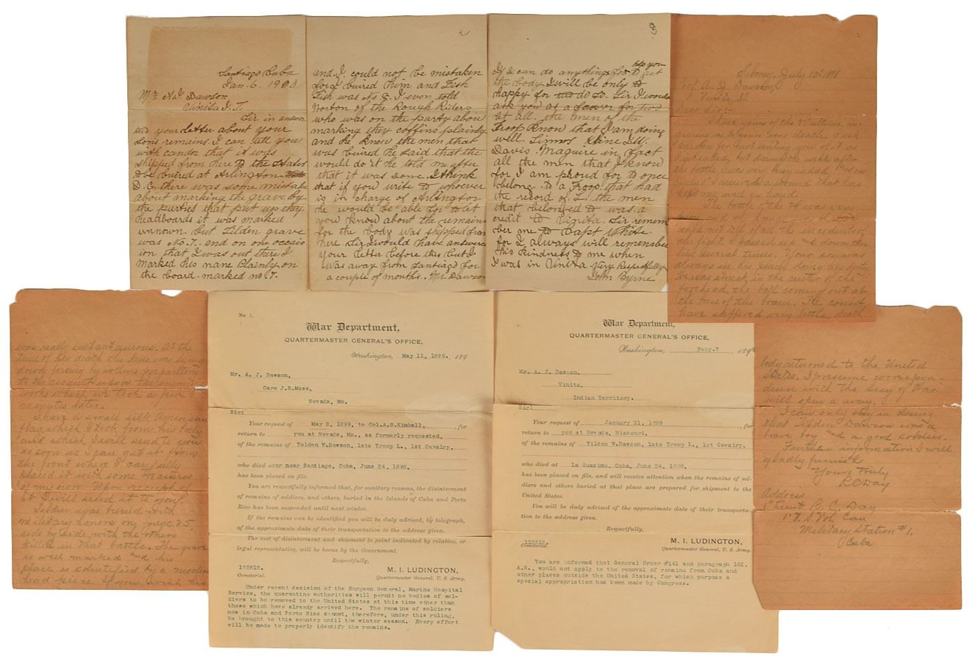 Amazing archive related to Rough Rider Tilden W. Dawson, one of the first Americans killed in the Spanish-American War, highlighted by a war-dated TLS to the fallen soldier's father from Colonel Theodore Roosevelt, signed "T. Roosevelt," two pages, 5.5 x 8.75, written while "In camp near Santiago de Cuba," July 31, 1898. In full: "I wish I could give you more definite assurances about the body of your gallant son, who was killed in our first fight, but I do not know whether the Government will send him back or not. I have no power to do it myself, glad though I would be able to send back every one of the gallant men who now lie dead on the Cuban battlefields. At present they all lie in the graves we dug for them. Your son's grave is marked and a record kept of it, and if the Government should ever wish to send him back we will be able to identify it at once. Pray accept my deepest sympathy, and yet though I sympathize with you I must congratulate you upon having a boy who did so well and who died a hero's death." Letters signed by Roosevelt from his two months leading the Rough Riders in Cuba are very scarce.