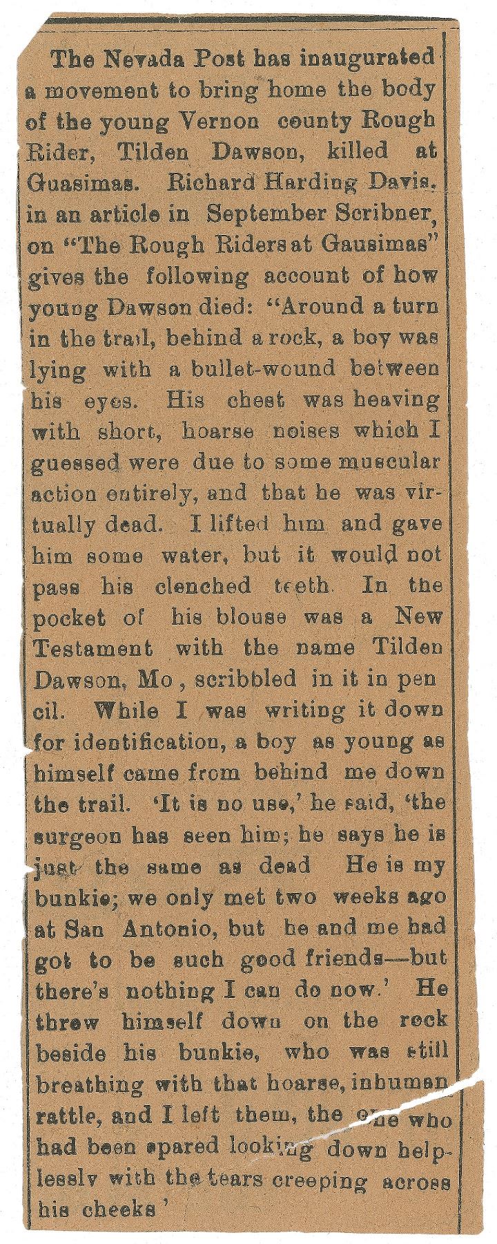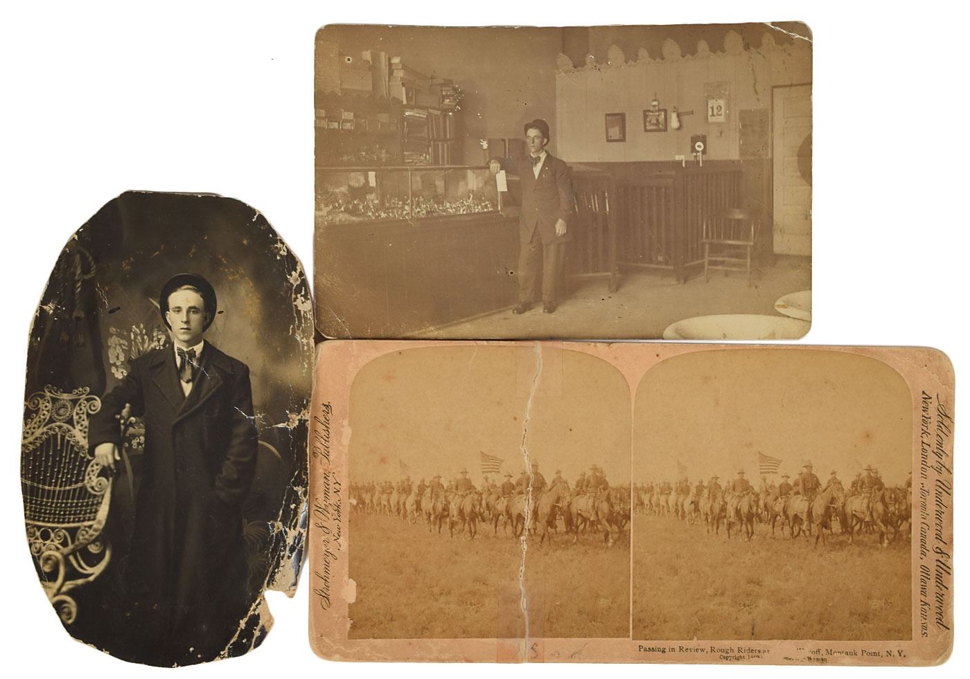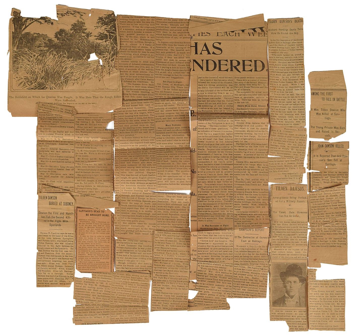 The balance of the archive comprises several additional letters, photographs, news clippings, and two pocket-sized books. One of the letters is an ALS from famed war correspondent Richard Harding Davis, four pages on two adjoining sheets, no date, also to Dawson's father, in part: "Your boy was shot almost among the first, and died, or lost consciousness, at once. His chest moved for some time but it was entirely muscular, and he suffered no pain. I examined his wound and washed it, and found he had been shot through the brain, the ball entered his head about two inches above his eyes. He was not disfigured as the wound was covered by his hair. He looked so young and handsome that I was more sorry for him almost than for all of the others, and I am glad you wrote to me so that I can tell you that he died among the first three men of the war, and in the very first fight…He was buried in a grave with eight others at a place where the trails meet on the top of a beautiful hill…I think I gave his testament to his 'bunkie' whose name I do not know." Davis described Dawson's death in his September 1898 article 'The Rough Riders at Guasimas,' mentioning the 'testament': "In the pocket of his blouse was a New Testament with the name Tilden Dawson, Mo, scribbled in it in pencil." Dawson's 'bunkie,' private Thomas Isbell (who was wounded at Las Guasimas), evidently returned this small red clothbound volume to his father, as it is present in this archive; the second volume included is Dawson's small book of Union Hymns. Among the other items are: two trimmed real photo postcards of Tilden Dawson in civilian clothing; a stereoview of the Rough Riders (cracked and repaired with tape); two official War Department documents concerning the disposition of Dawson's remains; a three-page ALS by Lieutenant Richard C. Day ("The battle of the 24 was very fierce…I passed up and down the line several times. Your son was always in his place doing his duty"); papers related to Dawson's Cherokee ancestry; and various other letters, papers, and a multitude of newspaper clippings. In overall very good to fine condition, with the Roosevelt letter showing some splitting along intersecting folds, and small areas of paper loss.