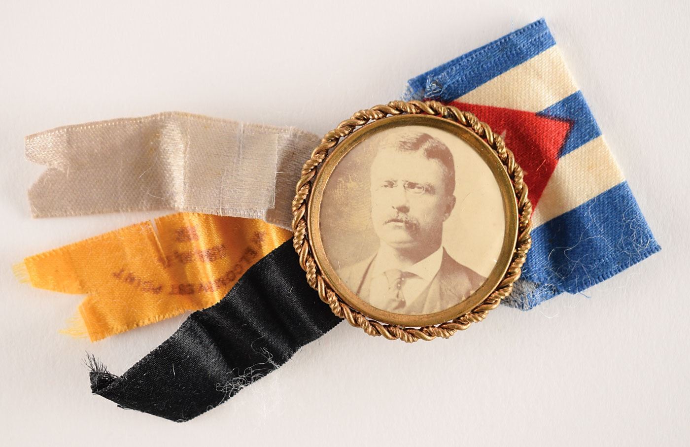 Pinback button and ribbon honoring President Theodore Roosevelt's visit to West Point in 1902, featuring a 1 1/2? portrait button at center, with a Cuban flag ribbon on one side and black, yellow, and silver ribbons on the other, the yellow ribbon reading: "Welcome West Point, June 9, 10, 11, 1902." In very good to fine condition, with some fraying to the ribbons. The United States Military Academy at West Point celebrated its hundred-year anniversary in 1902, and President Theodore Roosevelt attended the festivities, delivering the centennial speech on June 11th. In a moving tribute, President Roosevelt recognized the academy's contribution to the United States: 'This institution has completed its first hundred years of life. During that century no other education institution in the land has contributed so many names as West Point has contributed to the honor roll of the nation’s greatest citizens.'
