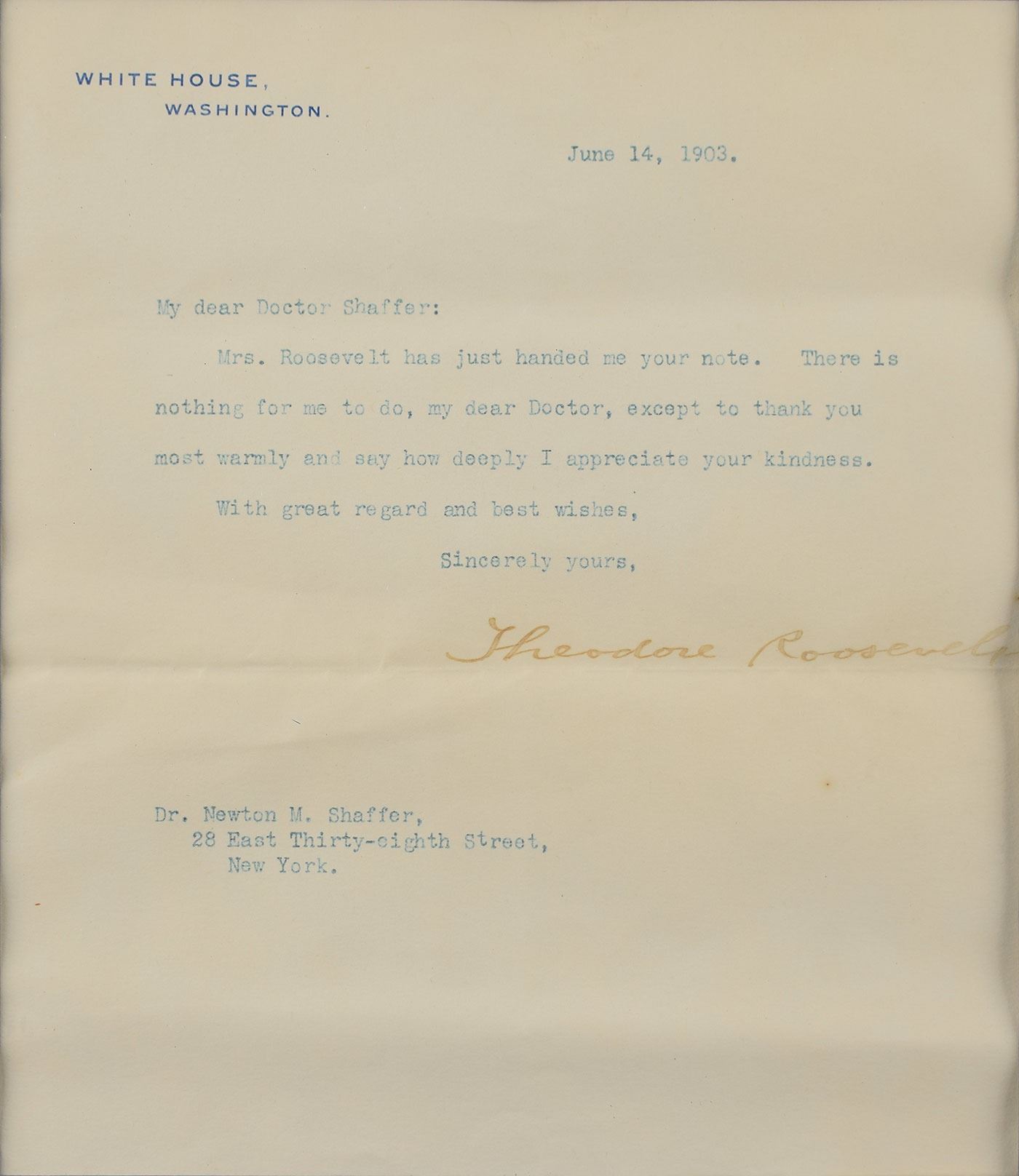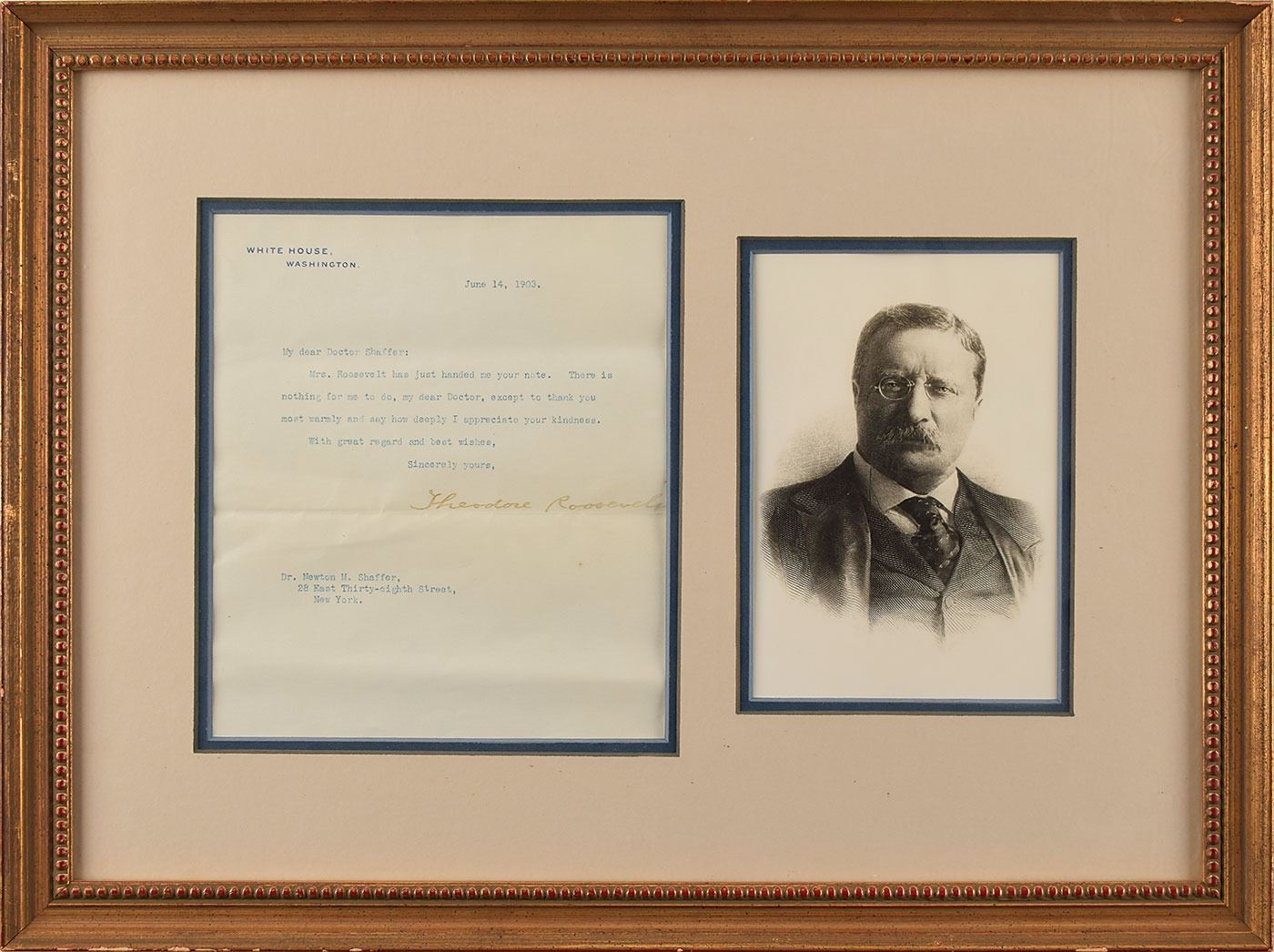 TLS as president, one page, 6.75 x 7.75, White House letterhead, June 14, 1903. Letter to Dr. Newton M. Schaffer, in full: "Mrs. Roosevelt has just handed me your note. There is nothing for me to do, my dear Doctor, except to thank you most warmly and say how deeply I appreciate your kindness. With great regard and best wishes." Double-matted and framed with an engraving of Roosevelt to an overall size of 18.5 x 13.75. In very good to fine condition, with light creasing, and two extra horizontal folds. Accompanied by the original mailing envelope.