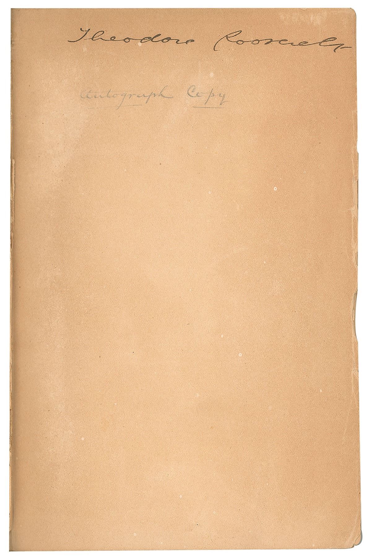Desirable signed book: The Rough Riders. First edition. NY: Charles Scribner's Sons, 1899. Hardcover, 6 x 8.5, 298 pages. Signed on the first free end page in ink, "Theodore Roosevelt." Autographic condition: very good to fine, with somewhat irregular overall toning to the signed page. Book condition: VG/None, with sunning to spine and boards, rubbing and edgewear, a cracked front hinge, mottled toning to endpapers, ownership inscription to title page, and a "Personal Library of R. L. MacDuffie" bookplate affixed to front pastedown.