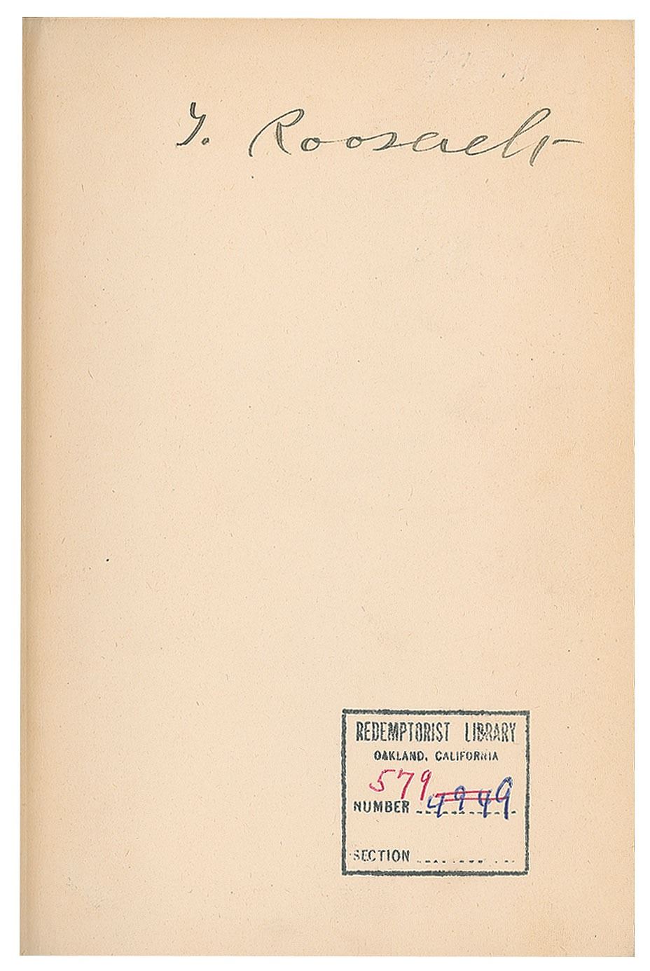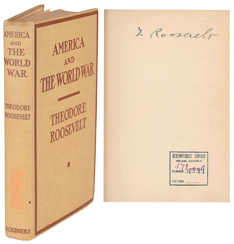 Signed book: America and the World War. Later printing. NY: Charles Scribner's Sons, 1915. Hardcover bound in tan cloth, 5.25 x 7.75, 277 pages. Signed on the first free end page in ink, "T. Roosevelt." Autographic condition: fine, with small erasures above and below the signature, and a rubber library stamp at the bottom of the signed page. Book condition: VG/None, with ex-library markings, adhesive residue to spine, and a "Library of Lawrence E. Miller" blindstamp to a rear page.