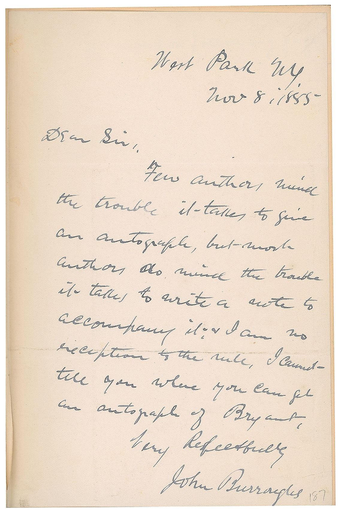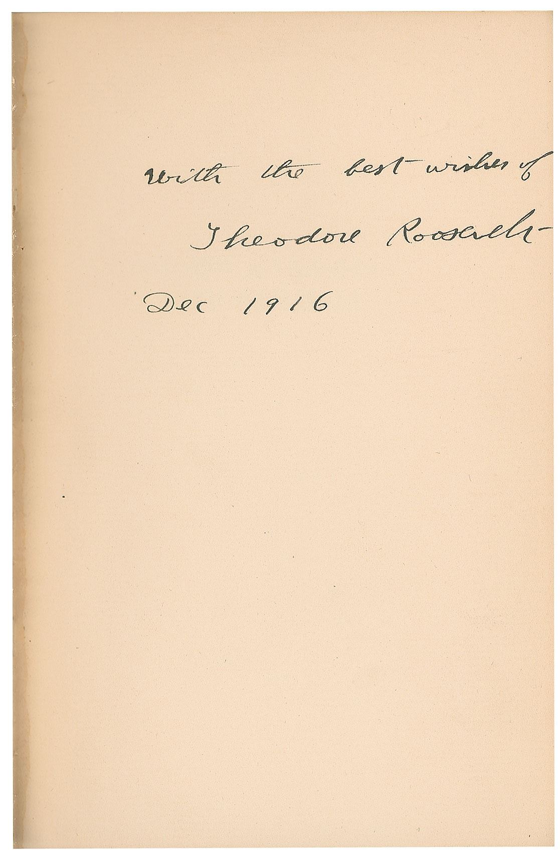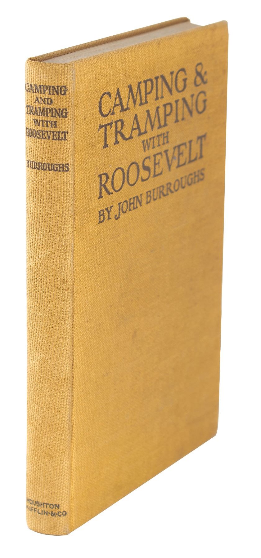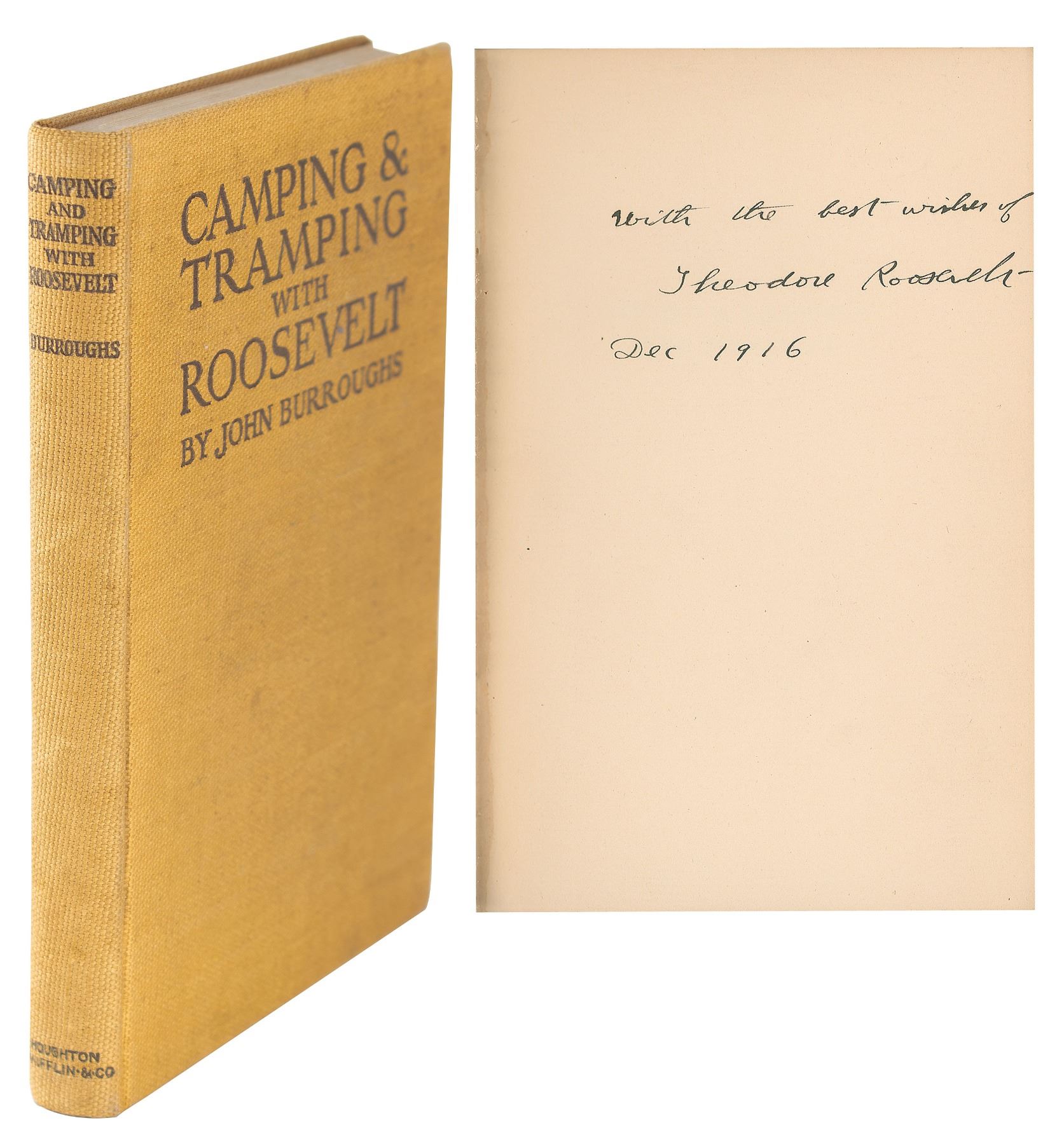 Signed book: Camping & Tramping with Roosevelt by John Burroughs. First edition. Boston: Houghton Mifflin, 1907. Hardcover bound in tan cloth with brown lettering, 5.25 x 7.5, 111 pages. Boldly signed on an endpaper in ink, "With the best wishes of Theodore Roosevelt, Dec. 1916." Affixed to the first free end page is an ALS by the author, signed "John Burroughs," in part: "Few authors mind the trouble it takes to give an autograph, but most authors do mind the trouble it takes to write a note to accompany it; I am no exception to the rule." Autographic condition: fine. Book condition: VG/None, with light sunning and scuffing to boards, a "Walter Merriam Pratt" bookplate affixed to the first free end page, and a "Library of Lawrence E. Miller" blindstamp to a rear page.