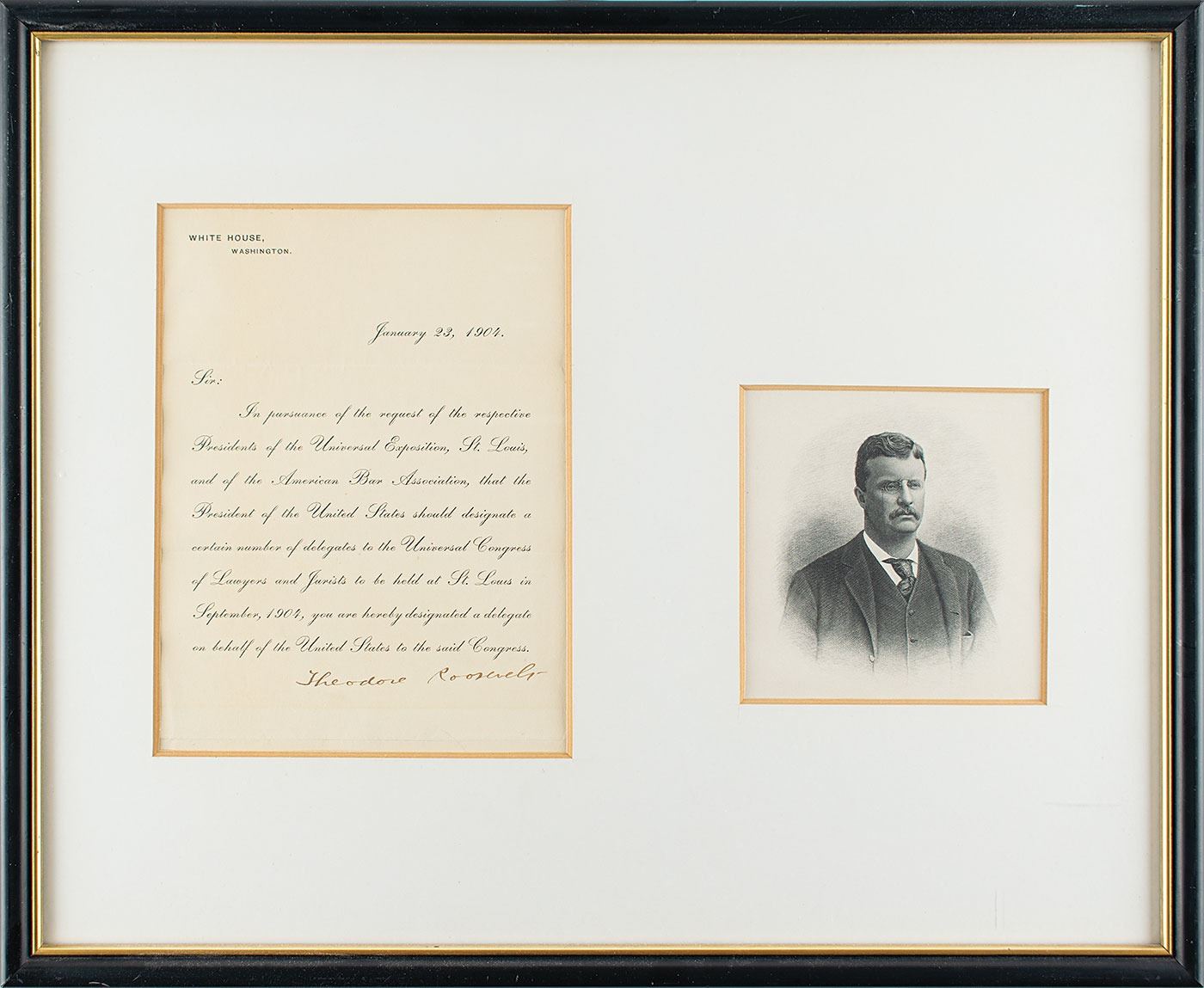 Interesting printed form letter, signed as president, "Theodore Roosevelt," one page, 7 x 9.5, White House letterhead, January 23, 1904. In full: "In pursuance of the request of the respective Presidents of the Universal Exposition, St. Louis, and of the American Bar Association, that the President of the United States should designate a certain number of delegates to the Universal Congress of Lawyers and Jurists to be held at St. Louis in September, 1904, you are hereby designated a delegate on behalf of the United States to the said Congress." Nicely matted and framed with an engraved portrait to an overall size of 21 x 17. In fine condition.