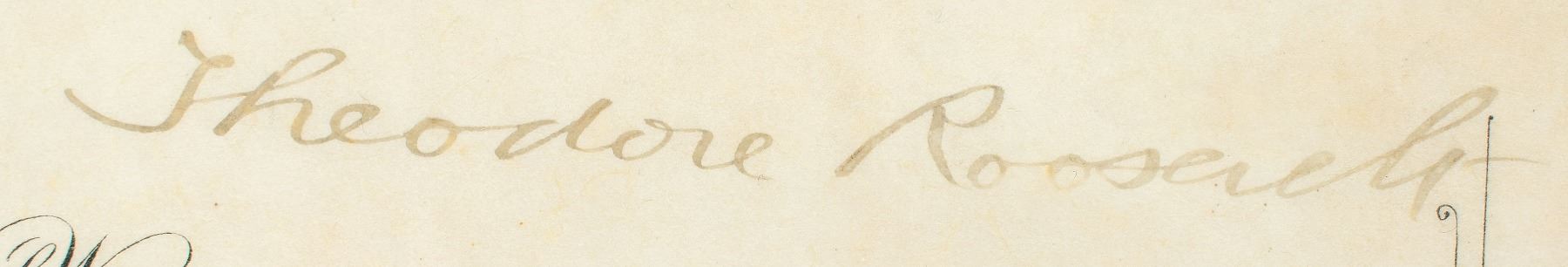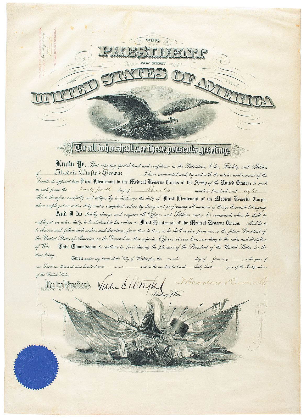 Partly-printed vellum DS as president, one page, 15 x 20.5, January 9, 1909. President Roosevelt appoints Rhodric Winfield Browne as a "First Lieutenant in the Medical Reserve Corps of the Army of the United States." Signed neatly at the conclusion by Theodore Roosevelt, and countersigned by Secretary of War Luke E. Wright. Embossed blue War Office seal remains affixed to lower left corner. In fine condition.