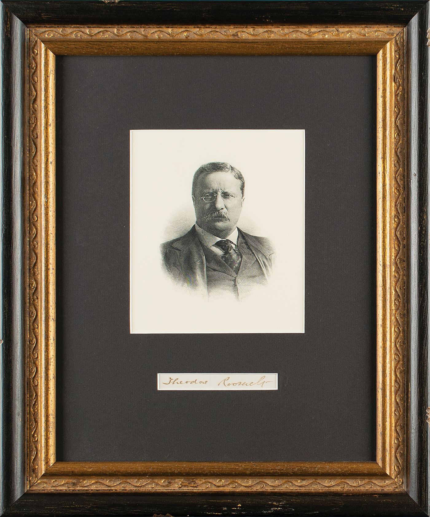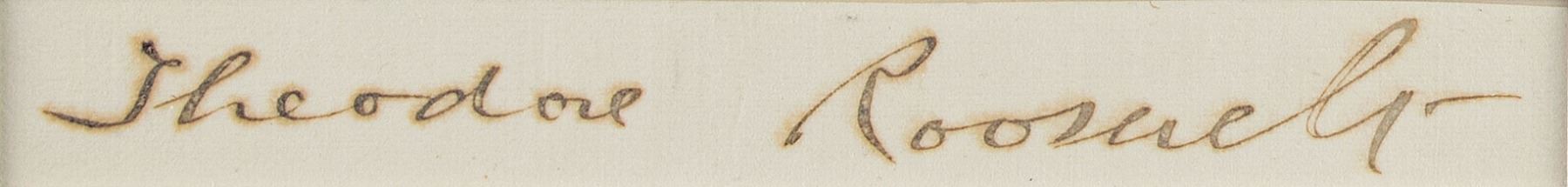 Ink signature, "Theodore Roosevelt,” on an off-white 4 x .5 slip, which is archivally matted and framed with an engraving to an overall size of 15 x 18. In fine condition.