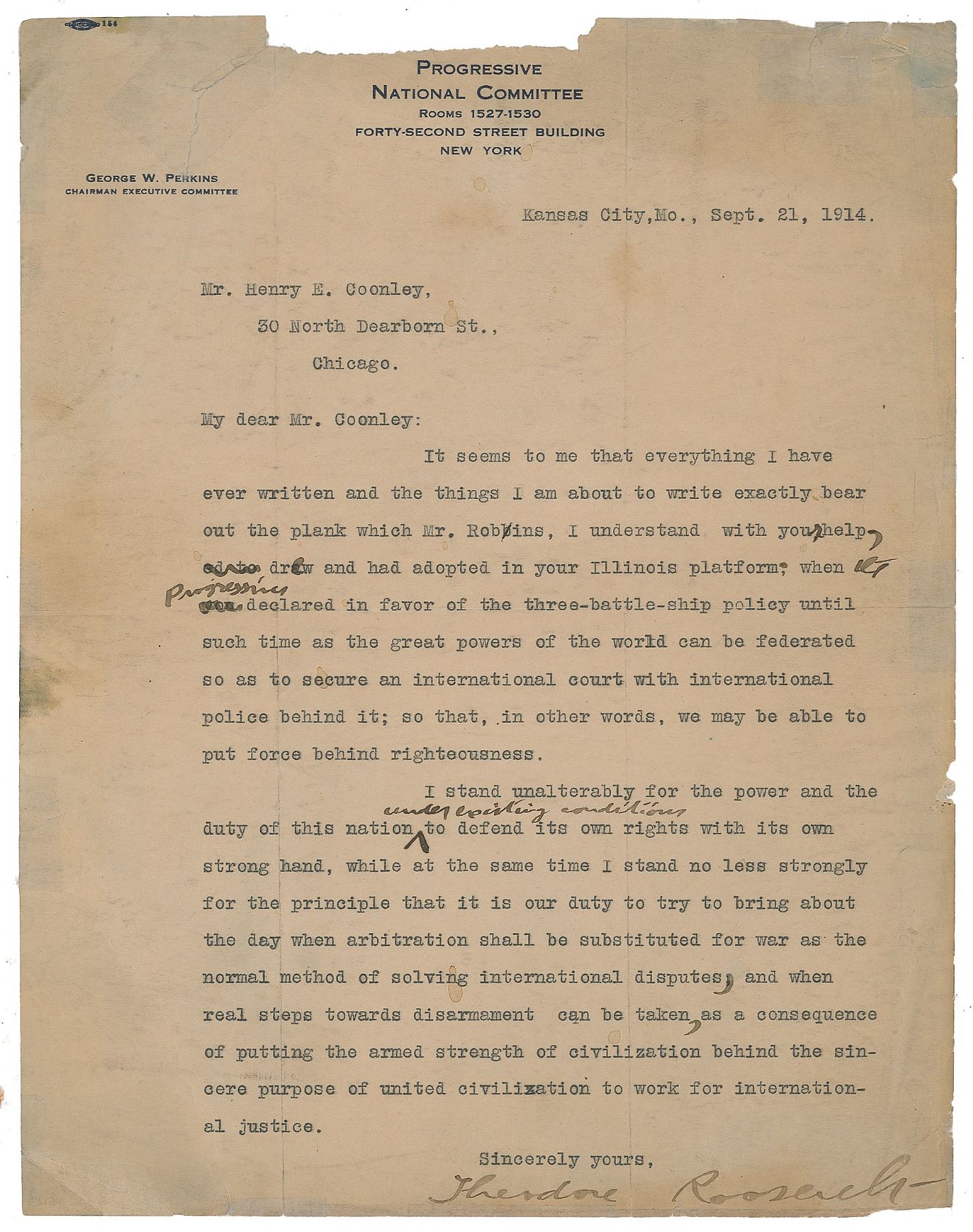 TLS, one page, 8.5 x 10.75, Progressive National Committee letterhead, September 21, 1914. Letter to Henry E. Coonley, in full: "It seems to me that everything I have ever written and the things I am about to write exactly bear out the plank which Mr. Robins, I understand with your help, drew and had adopted in your Illinois platform; when the progressives declared in favor of the three-battle-ship policy until such time as the great powers of the world can be federated so as to secure an international court with international police behind it; so that, in other words, we may be able to put force behind righteousness. I stand unalterably for the power and the duty of this nation under existing conditions to defend its own rights with its own strong hand, while at the same time I stand no less strongly for the principle that it is our duty to try to bring about the day when arbitration shall be substituted for war as the normal method of solving international disputes, and when real steps towards disarmament can be taken, as a consequence of putting the armed strength of civilization behind the sincere purpose of united civilization to work for international justice." Roosevelt makes several handwritten corrections to the text. In very good condition, with creasing, toning, soiling, paper loss to the top edge, and tape repairs on the reverse.