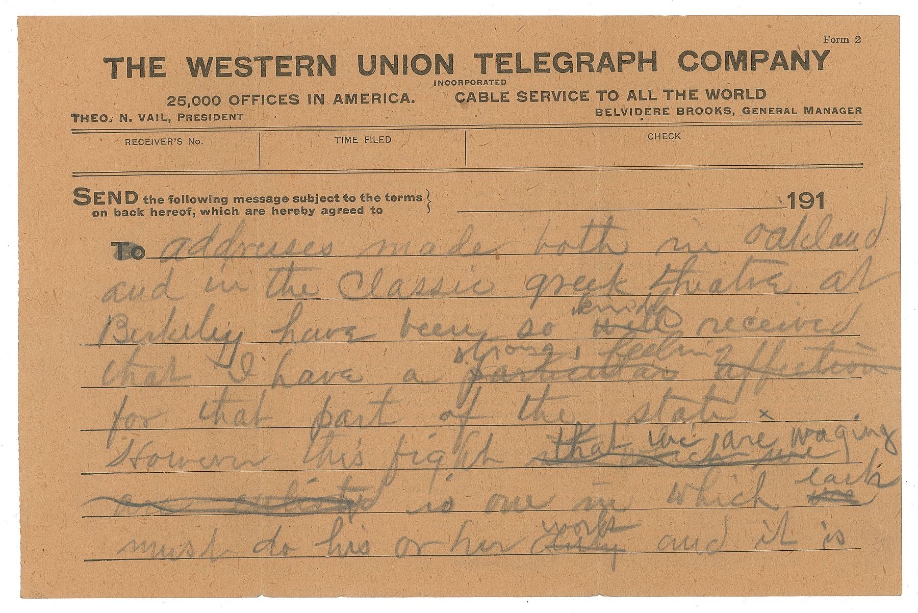 Manuscript draft signed in pencil, "Theodore Roosevelt," three pages, 7.75 x 5.25, Western Union Telegraph Company letterhead, no date. Draft written in another hand and signed by Roosevelt, evidently for a speech or other address. In part: "On leaving California I cannot but express my regret that the limited time at my disposal and the arrangements made by the progressive committee did not permit of my again meeting my friends in Alameda County. My previous visits have been so pleasant and my addresses made both in Oakland and in the Classic Greek Theatre at Berkeley have been so kindly received that I have a strong feeling for that part of the state. However this fight that we are waging is one in which each must do his or her work and it is imperative that I do mine regardless of my personal wishes, by going to the places where the progressive principles are not so well understood and so heartily supported as they are in California." In fine condition.