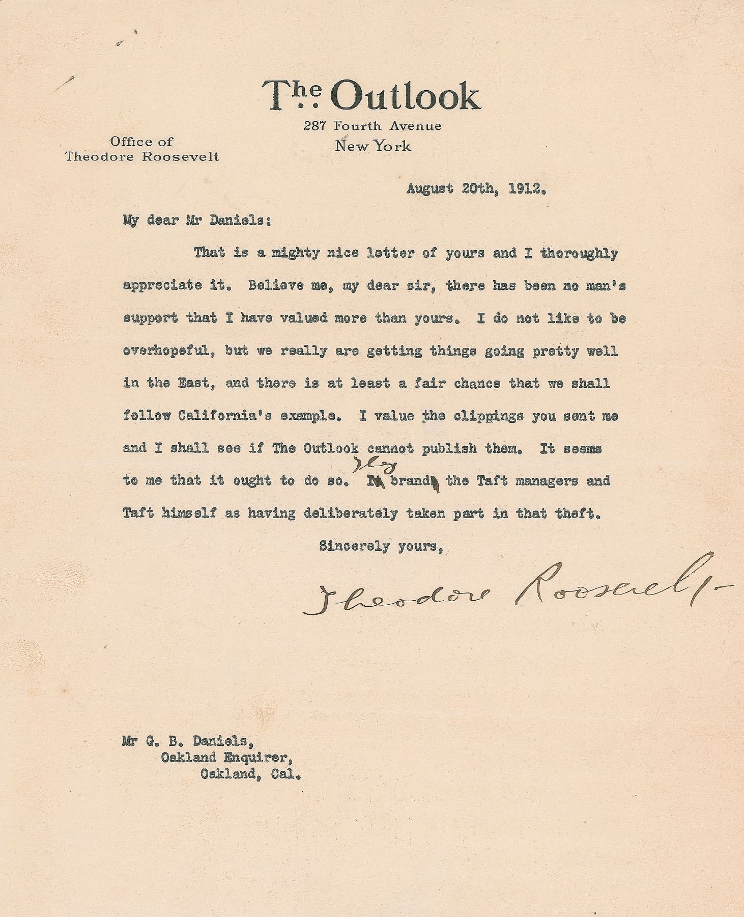 TLS, one page, 7.75 x 9.5, The Outlook letterhead, August 20, 1912. Letter to G. B. Daniels of the Oakland Enquirer, in part: "That is a mighty nice letter of yours and I thoroughly appreciate it. Believe me, my dear sir, there has been no man's support that I have valued more than yours. I do not like to be overhopeful, but we really are getting things going pretty well in the East, and there is at least a fair chance that we shall follow California's example. I value the clippings you sent me and I shall see if The Outlook can publish them. It seems to me that it ought to do so. They brand the Taft managers and Taft himself as having deliberately taken part in that theft." Roosevelt makes a handwritten correction to the text. In fine condition, with pin holes to the upper left corner. Accompanied by a two-page retained carbon copy of Daniels's letter to Roosevelt.