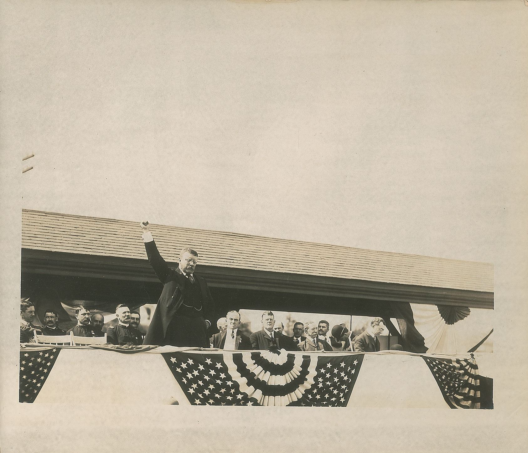 High-quality booklet published by Woodbury-Carlton Co. entitled "Souvenir of President Roosevelt's Visit to Gardner" on September 2, 1902, 10.25 x 8.25, reprinting his address and containing 11 photographic plates portraying the event, ten of which show President Roosevelt speaking from a banner-clad platform. In fine condition, with some minor paper loss along the spine.