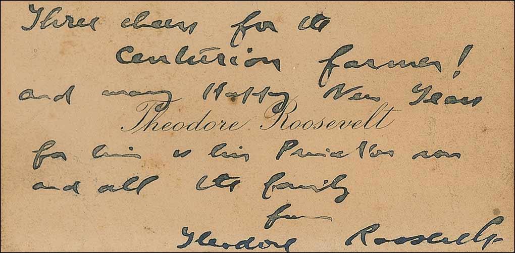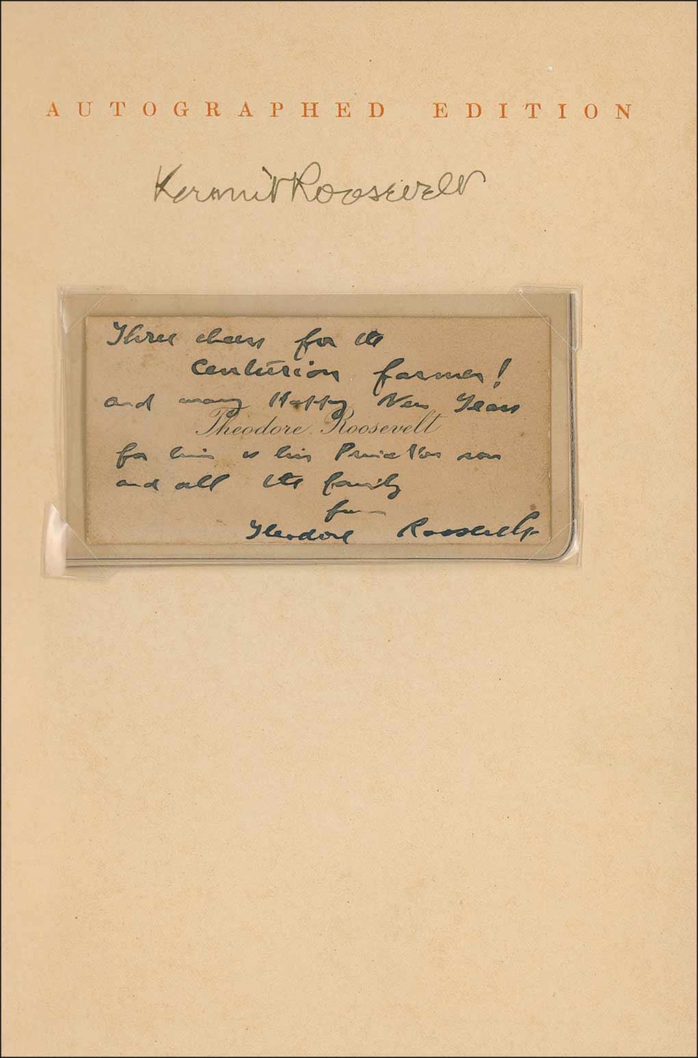 ANS, one page, 3 x 1.5, on his personal calling card, no date. Note reads, “Three cheers for the centurion farmer! And many Happy New Years for him & his Princeton son and all the family, from Theodore Roosevelt.” Card is housed in a plastic pouch affixed by four photo corners to the limitations page of the 1921 Autograph Edition of “The Long Trail,” authored and signed by Theodore Roosevelt’s son, Kermit Roosevelt. Scattered toning and foxing, otherwise fine condition. Book rates very good overall.