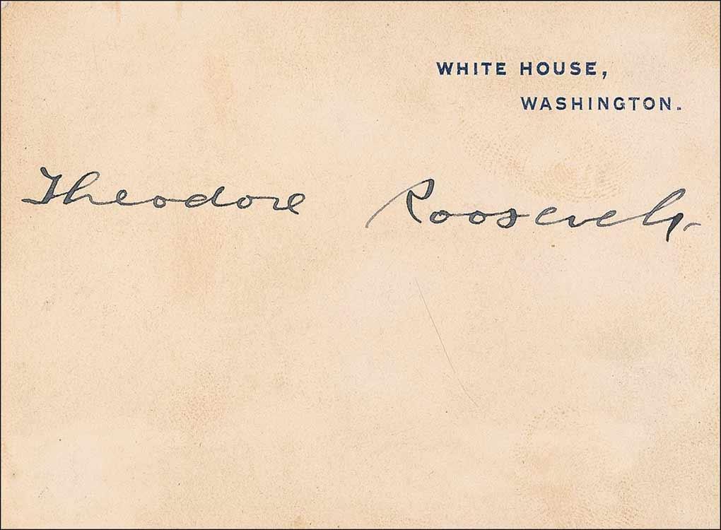 White House card, neatly signed in black ink, “Theodore Roosevelt.” In very good condition, with scattered light toning, a small fingerprint, and mounting remnants to reverse.