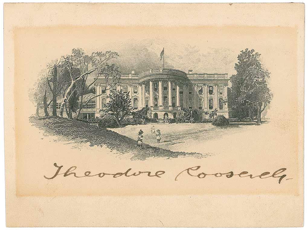 Very nice engraved vignette featuring children playing on lawn of the South Portico of the White House, 4.75 x 3.5, signed in black ink, “Theodore Roosevelt.” A light overall block of toning over image and signature from previous display, otherwise fine condition.