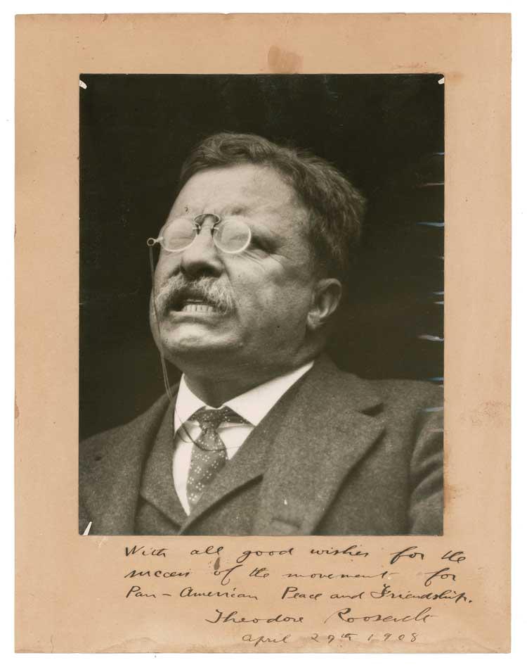 Vintage glossy 8 x 10 photo of Roosevelt with an emphatic grimace on his face, affixed to its original 10.75 x 14 mount, signed and inscribed as president in black ink on the mount, “With all good wishes for the success of the movement for Pan-American Peace and Friendship, Theodore Roosevelt, April 27th, 1908.” In very good condition, with edge rippling and scattered light surface marks to the photograph, scattered light toning and soiling to mount, light damp staining to bottom edge affecting the date, and a few edge creases and tears to mount.