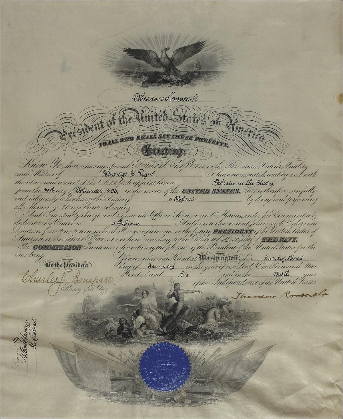 Partly-printed DS as president, one page, 15.25 x 18.5, January 23, 1906. Roosevelt appoints George W. Dizel a Captain in the Navy. Signed at the conclusion by Roosevelt, and countersigned by Secretary of the Navy Charles Bonaparte. Toning and soiling to lower portion, a couple trivial pin holes, and light wrinkling and creasing, otherwise fine condition. Pre-certified John Reznikoff/PSA/DNA and RRAuction COA.