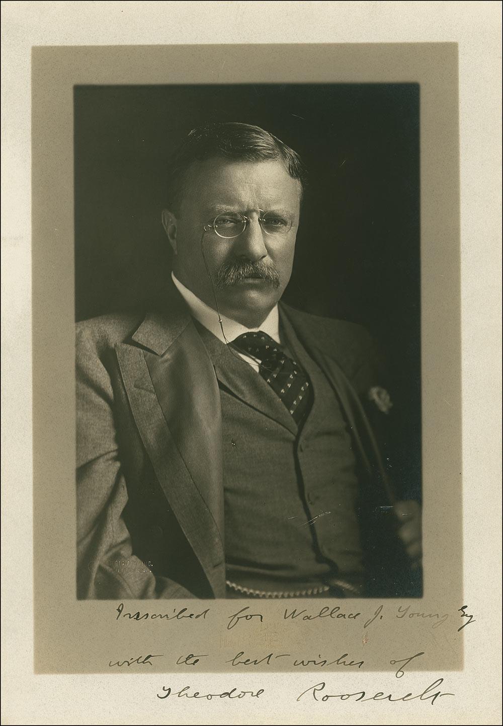 Vintage matte-finish 9 x 13 Harris and Ewing portrait, signed and inscribed in the lower border in fountain pen “Inscribed for Wallace J. Young Esq., with the best wishes of Theodore Roosevelt.” Some scattered light surface scuffs to image, otherwise fine condition. Roosevelt’s signature measures an impressive five inches long. Pre-certified John Reznikoff/PSA/DNA and RRAuction COA.