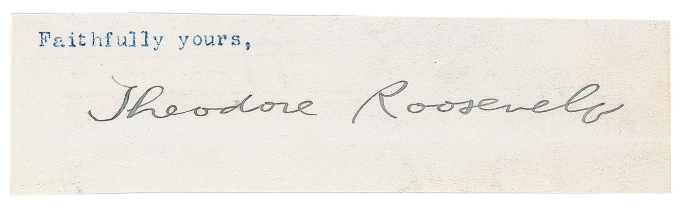 Ink signature, “Theodore Roosevelt,” on an off-white 4.25 x 1.25 slip clipped from the closing of a TLS. A few light creases and a horizontal fold under signature, otherwise fine condition. Pre-certified John Reznikoff/PSA/DNA and RRAuction COA.