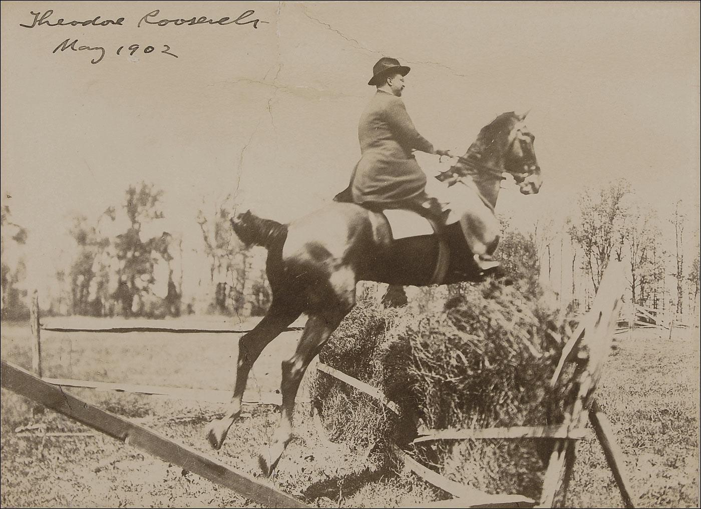 Vintage sepia matte-finish 9 x 6.5 photo of Roosevelt on his favorite horse, Bleistein, leaping over a brush hurdle, signed in black ink, as president, “Theodore Roosevelt, May 1902.” Photo is affixed to a larger mount, which is then matted to an overall size of 14.25 x 12. Four noticeable creases to photo, mostly to background, with one through small portions of horse’s tail and hind leg, small ding under date, and a couple hints of trivial soiling, otherwise very good condition.This photograph was taken on May 3, 1902, by the renowned Washington, D. C. photographer Barnett McFee Clinedinst at the Chevy Chase Club in Chevy Chase, Maryland. Roosevelt had left the White House on Bleistein and rode the six miles to Chevy Chase. From Outdoor Pastimes of an American Hunter by Theodore Roosevelt (Charles Scribner’s Sons: New York, 1906): “One day, May 3, 1902, I took him out to Chevy Chase and had him photographed while jumping various fences and brush hurdles.” Pre-certified John Reznikoff/PSA/DNA and RRAuction COA.