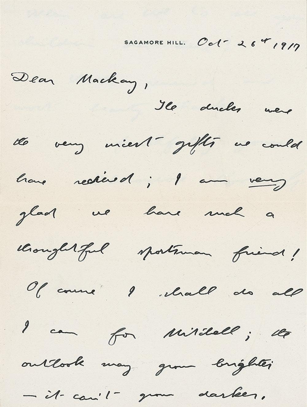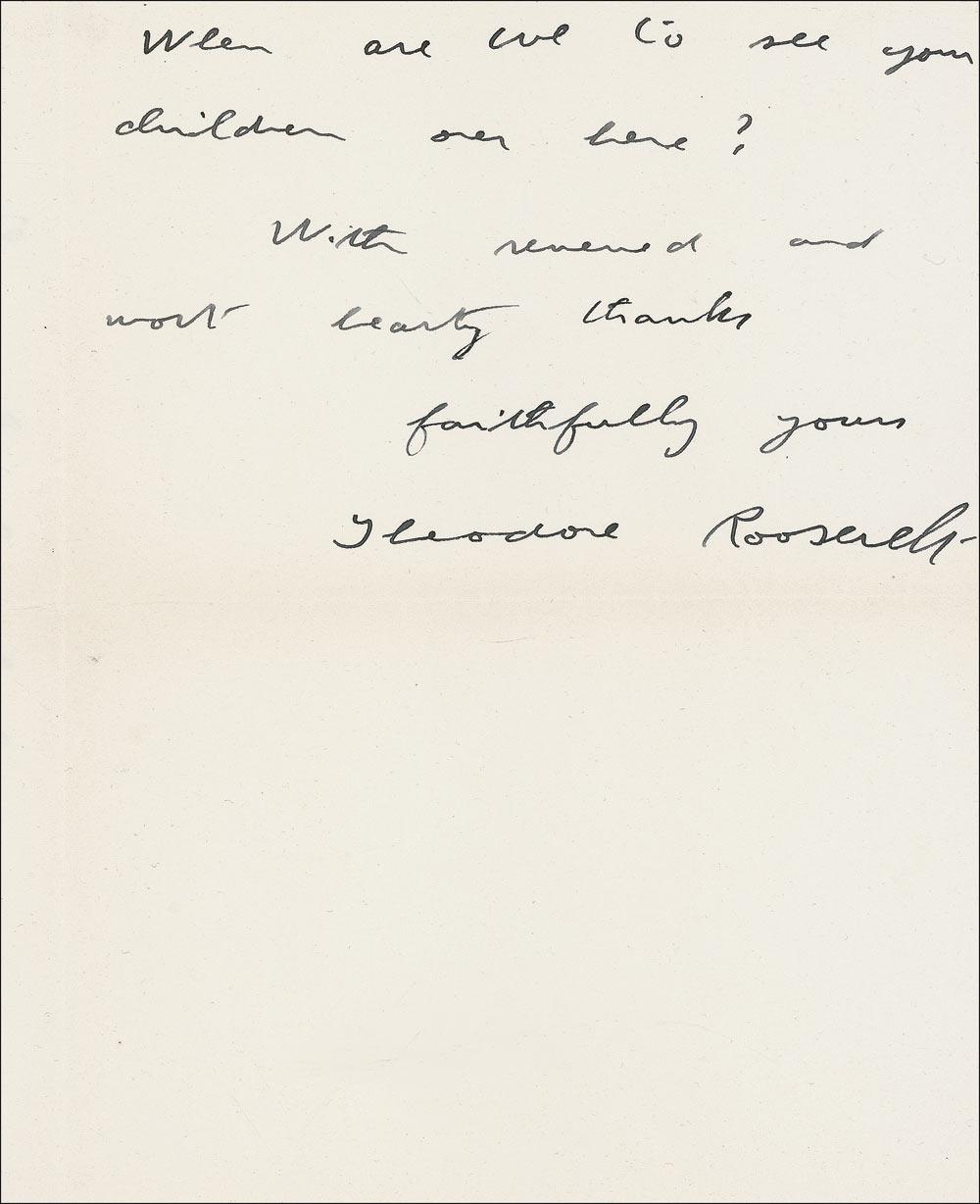 ALS, two pages, 5.75 x 7.75, Sagamore Hill letterhead, October 26, 1917. Roosevelt writes to prominent financier Clarence Hungerford Mackay (1874–1938). In full: “The ducks were the very nicest gifts we could have received; I am very glad we have such a thoughtful sportsman friend! Of course I shall do all I can for Mitchell; the outlook may grow brighter—it can’t grow darker. When are we to see your children over here?” In clean, fine condition. Accompanied by the original mailing envelope addressed in Roosevelt’s hand, bearing two “Buy a Liberty Loan Bond” stampings.