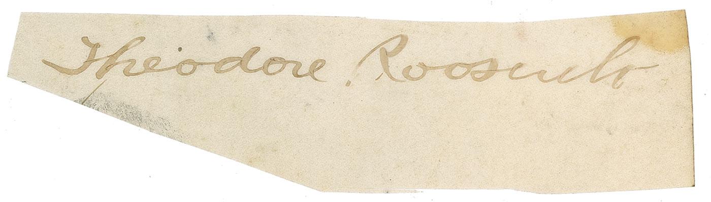 Ink signature, “Theodore Roosevelt,” on an off-white 5 x 1.25 irregularly trimmed vellum slip. In fine condition, with small stain to top right corner. Accompanied by an unsigned glossy 8 x 10 photo of Roosevelt in his Rough Rider uniform.