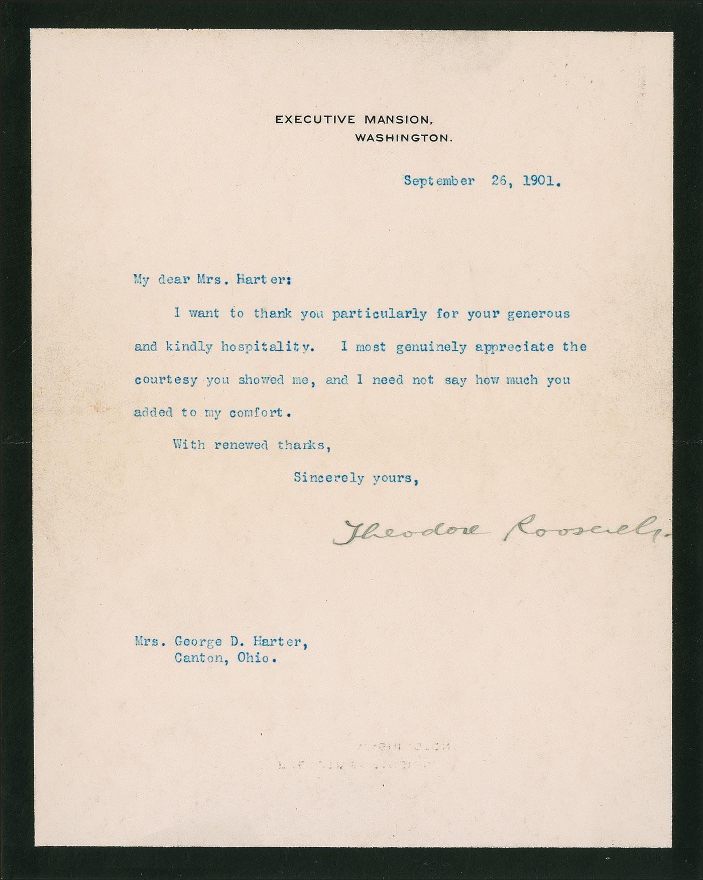 TLS as president, one page, 7.25 x 9, black-bordered Executive Mansion letterhead, September 26, 1901. Letter to Mrs. George D. Harter, Canton, Ohio. In full: “I want to thank you particularly for your generous and kindly hospitality. I most genuinely appreciate the courtesy you showed me, and I need not say how much you added to my comfort.” A bit of scattered light soiling, faint mirroring of letterhead to bottom, and some light wrinkling, otherwise fine condition. President McKinley died on September 14, 1901. From page one of The New York Times, September 19, 1901, datelined Canton, Ohio, Sept. 18. In part: “President Roosevelt, his brother-in-law, Commander Cowles; Secretary Root, and Assistant Secretary Hall are at the residence of Mrs. George D. Harter in Market Street. A company of the Ohio militia guards the house. During the afternoon the President walked over to the McKinley residence to inquire after Mrs. McKinley…After President Roosevelt returned, he remained quietly at the Harter residence throughout the afternoon and evening. He dined privately, and, although there were quite a number of callers in the evening, he remained in seclusion.” Accompanied by the original black-bordered mailing envelope.