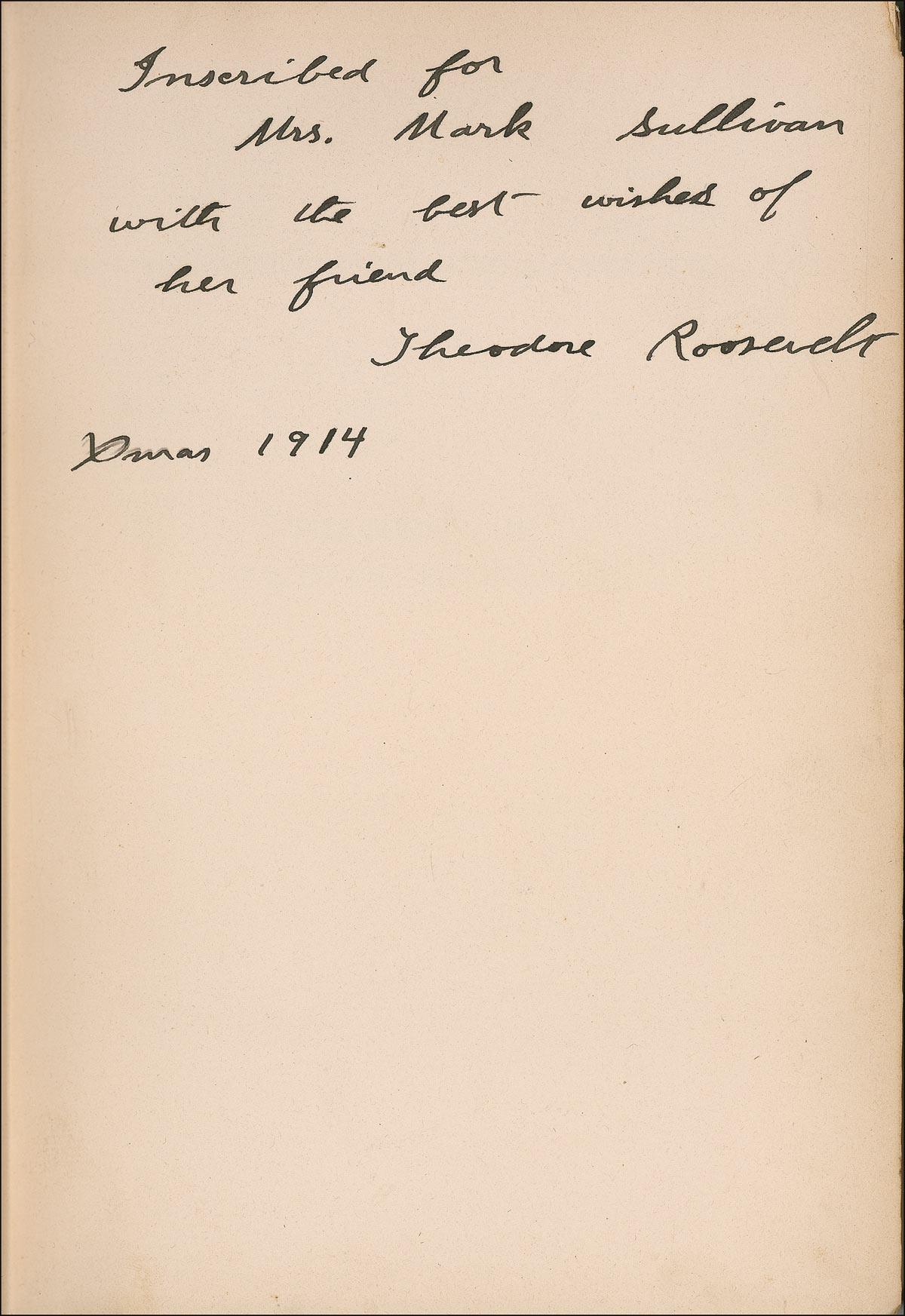 Signed book: Through the Brazilian Wilderness. First edition, first printing. NY: Scribners, 1914. Hardcover, 7 x 9.75, 383 pages. Beautifully signed and inscribed on the first free end page, “Inscribed for Mrs. Mark Sullivan with the best wishes of her friend, Theodore Roosevelt, Xmas 1914.” In very good to fine condition, with a uniform faint shade of light toning to signed page, partial separation along hinges, rubbing and wear to covers, as well as some moderate sunning and spotting, and wear to head and tail, of the spine. The expedition’s map is still present, and still attached to the book as intended.