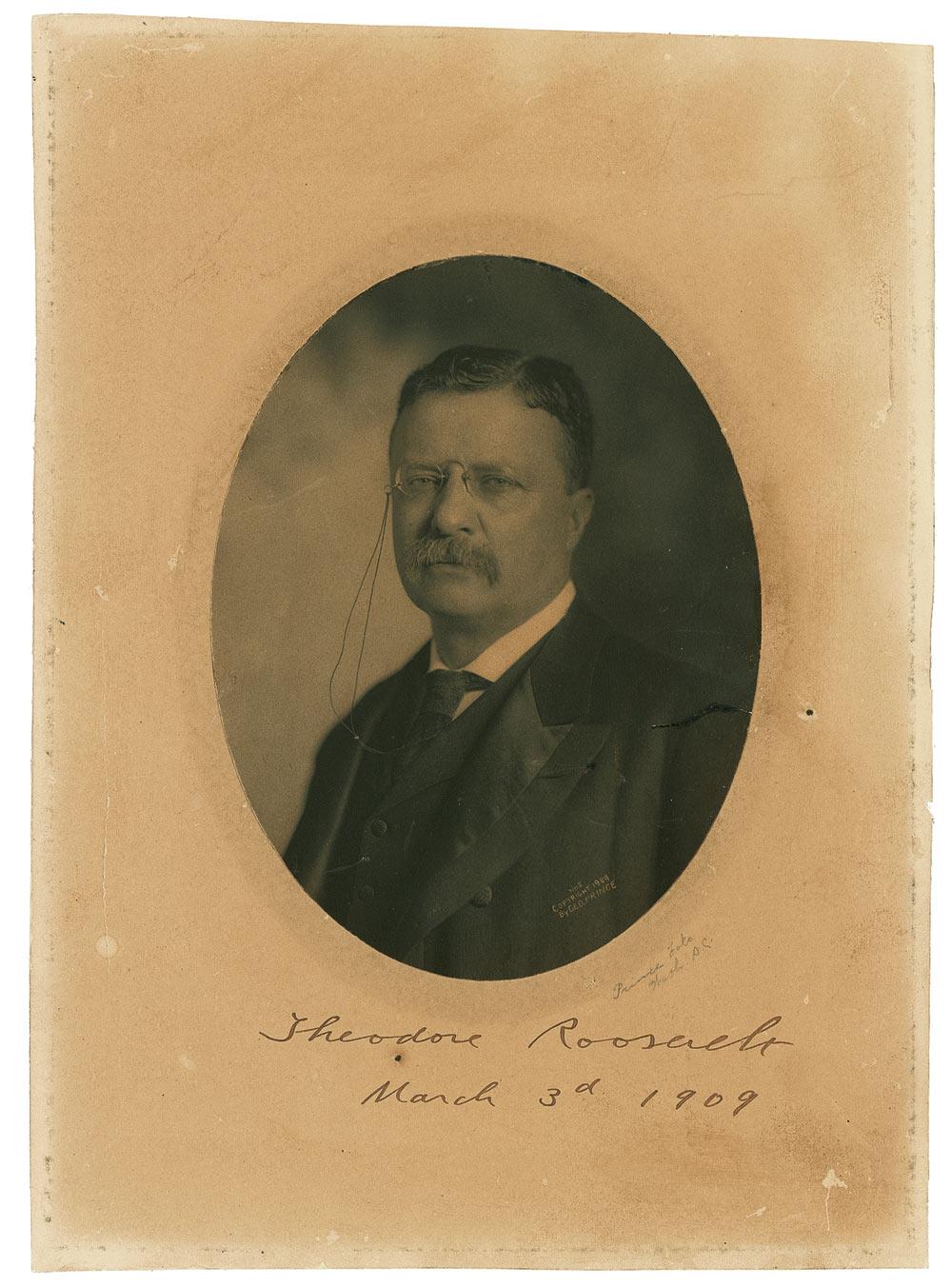 Vintage matte-finish 6 x 8 oval portrait by George Prince, and affixed to its original 10 x 14 mount, signed on the mount under the image in black ink, as president, “Theodore Roosevelt, March 3d, 1909.” In very good condition, with tear to right side of photo, moderate toning to mount, a vertical separation along left side of mount, edge soiling from previous framing, mounting remnants on reverse, and a small pencil notation under image. Just days after the end of his administration, Roosevelt left for his well-known African safari. Undoubtedly one of the last items signed by Roosevelt during his administration.