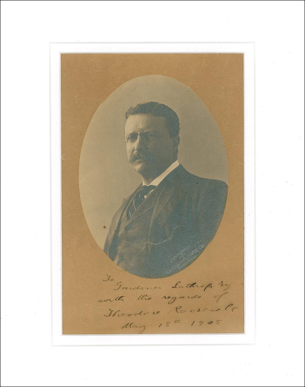 Vintage matte-finish 5.25 x 7.5 oval-shaped C. M. Bell photo affixed to its 8.5 x 12 cardboard mount, signed and inscribed on the mount in fountain pen “To Gardiner Lathrop with the regards of Theodore Roosevelt. May 18th, 1905.” In very good condition, with cracking, chipping, and silvering to the image and mild soiling and missing corners to the mount. Most of the mount’s faults can be easily matted out.