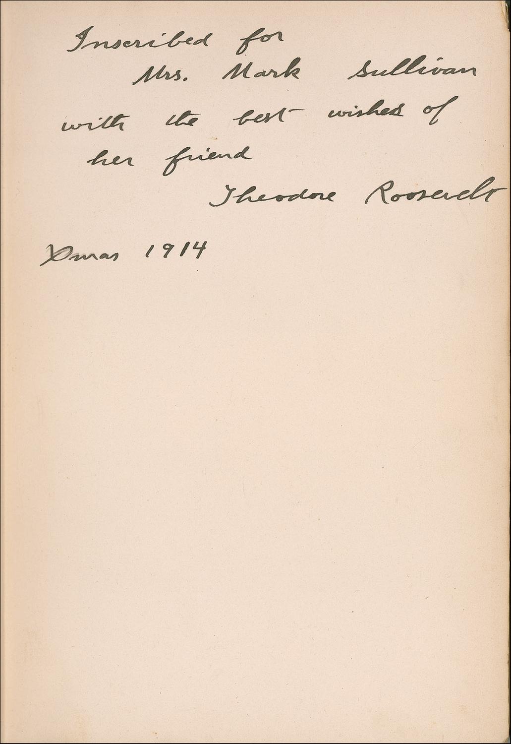 Signed book: Through the Brazilian Wilderness. First edition, first printing. NY: Scribners, 1914. Hardcover, 7 x 9.75, 383 pages. Beautifully signed and inscribed on the first free end page, “Inscribed for Mrs. Mark Sullivan with the best wishes of her friend, Theodore Roosevelt, Xmas 1914.” In very good to fine condition, with a uniform faint shade of light toning to signed page, partial separation along hinges, rubbing and wear to covers, as well as some moderate sunning and spotting, and wear to head and tail, of the spine. The expedition’s map is still present, and still attached to the book as intended.