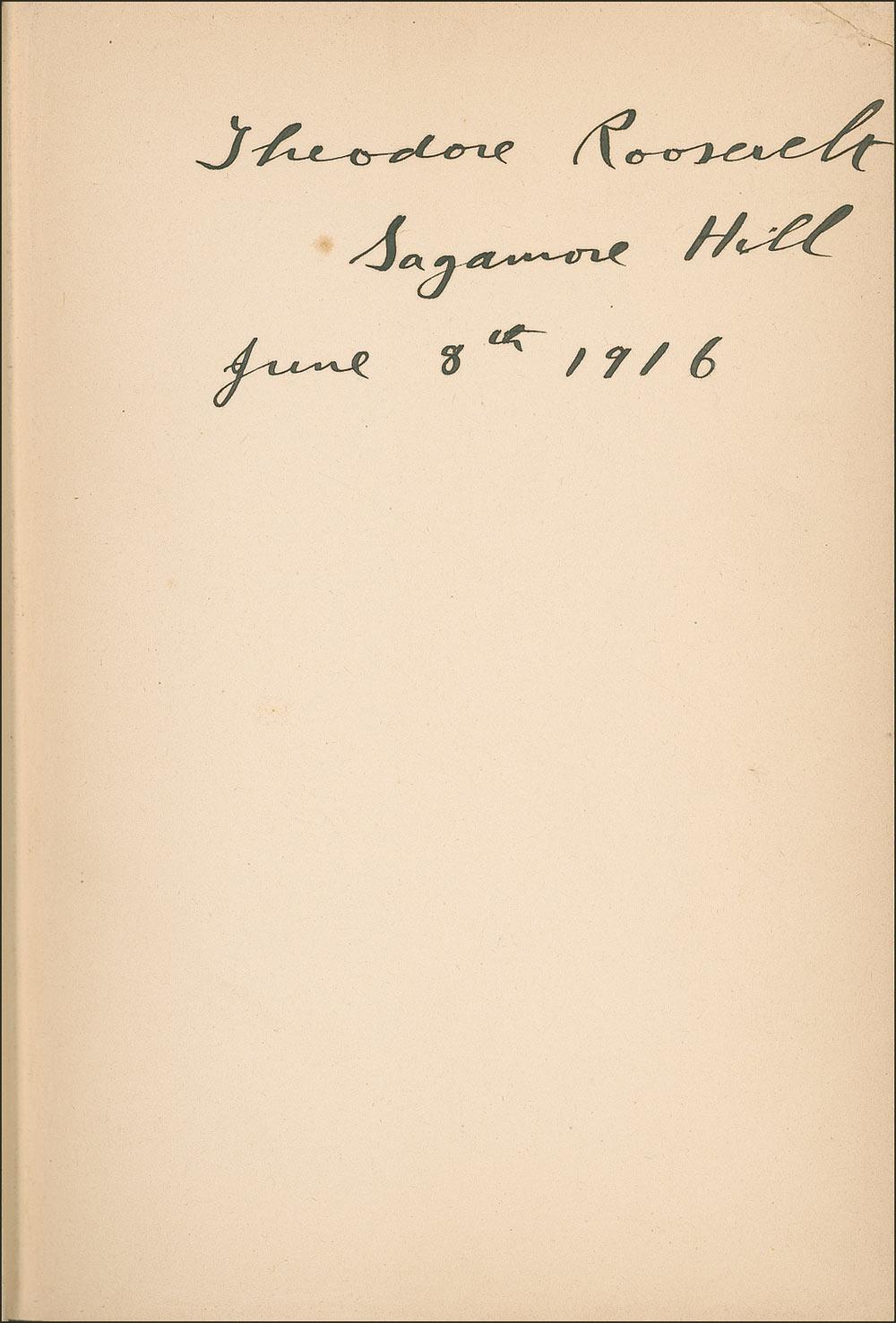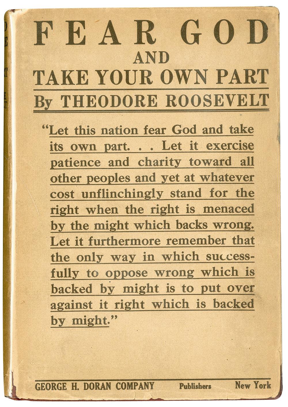 Signed book: Fear God and Take Your Own Part. First edition. NY: George H. Doran Company, 1916. Hardcover with dustjacket, 6 x 8.25, 413 pages. Signed in fountain pen on the first free end page, “Theodore Roosevelt, Sagamore Hill, June 8th, 1916.” Scattered light toning to the pages and repaired upper corner tip to signed page; the dustjacket has light wear to the covers, small chips, tears, and some soiling, otherwise fine condition. A unique tome as TR urged the nation to prepare for world war.