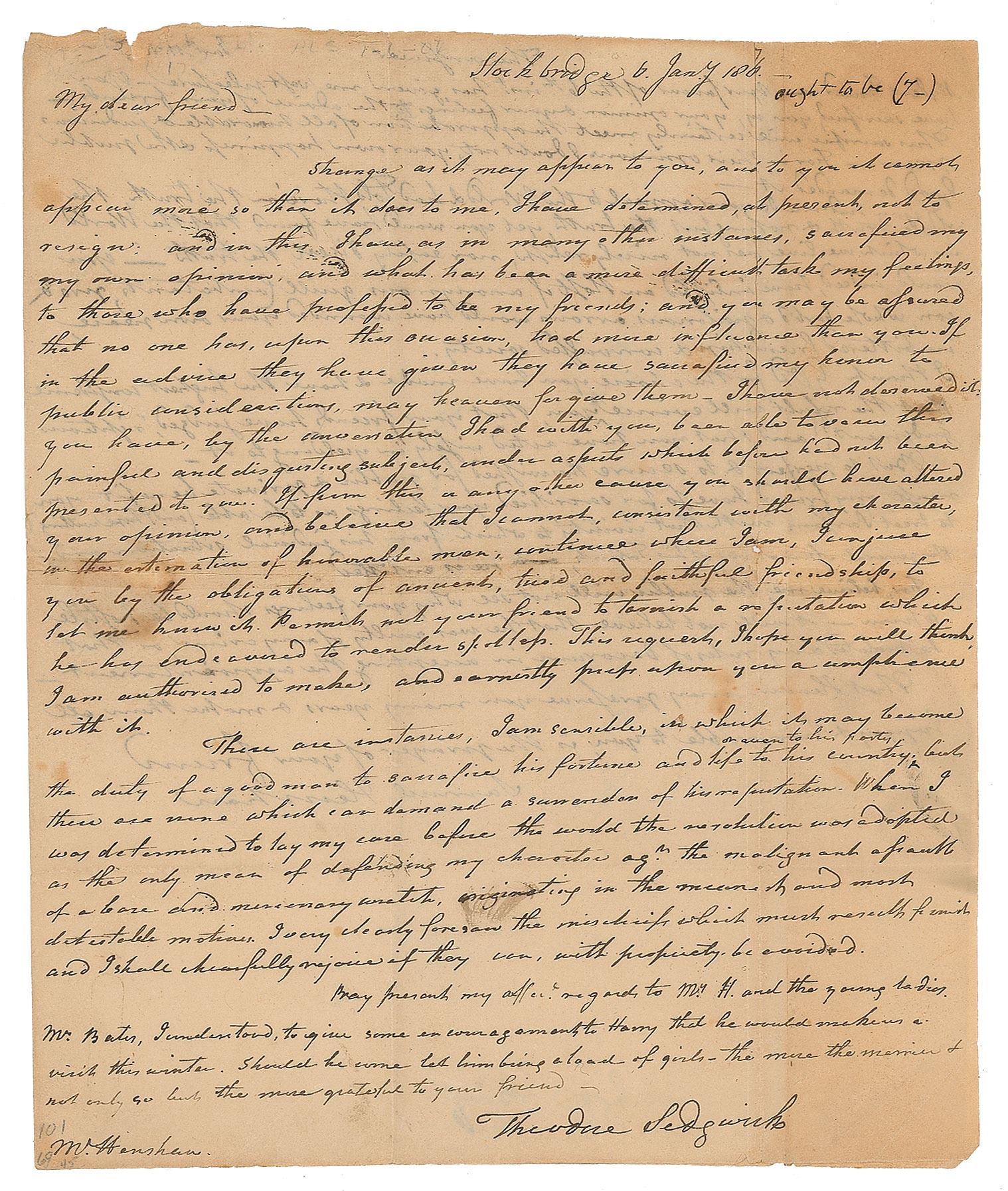 ALS, one page, 8.5 x 10, January 6, 1807. Letter to Samuel Henshaw, in part: "Strange as it may appear to you, and to you it cannot appear more so than it does to me, I have determined, at present, not to resign…You may be assured that no one has, upon this occasion, had more influence than yourself in the advice they have given they have sacrificed my honor to public considerations, may heaven forgive them—I have not deserved it. You have, by the conversation I had with you, been able to view this painful and disgusting subject, under aspects which before had not been presented to you. If from this or any other cause you should have altered your opinion, and believe that I cannot, consistent with my character…continue where I am…let me know it. Permit not your friend to tarnish a reputation which he has endeavoured to render spotless. This request, I hope you will think I am authorized to make, and earnestly press upon you a compliance with it. There are instances, I am sensible, in which it may become the duty of a good man to sacrifice his fortune and life to his country, or even to his party, but there are none which can demand a surrender of his reputation. When I was determined to lay my case before the world the resolution was adopted as the only mean of defending my character ag't the malignant assault of a bare and mercenary wretch, originating in the meanest and most detestable motions." Henshaw pens his response on the reverse, offering words of support. In very good condition, with splitting along intersecting folds, a short tear to the top edge, and seal-related paper loss to the integral address leaf.