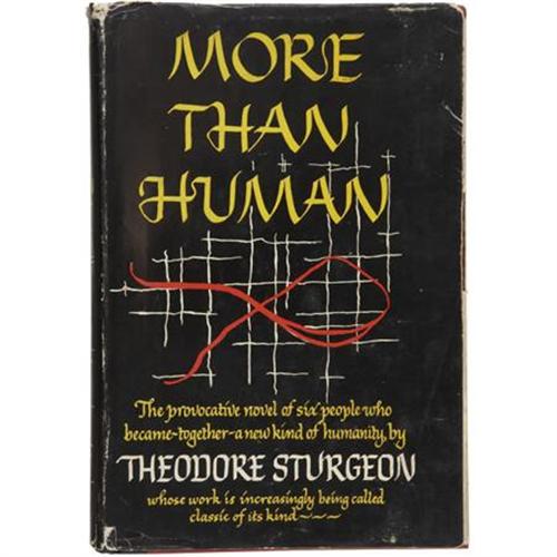 <B>Theodore Sturgeon. </B></I><B><I>More Than Human</B></I></B></I><B>.</B></I> New York: Farrar, Straus and Young, 1953.<BR> <BR>First edition, Currey A. Octavo. 233 pages. <BR><BR>Publisher's red boards and black cloth backstrip with titles in white. Faint stain at the bottom edge of the boards else light shelf wear. Contents sound. Dust jacket folded slightly off center on the front panel with wear at the head and foot of the spine and soiling to the back panel. General shelf wear and soiling. Very good. <I>From the Robert and Diane Yaspan Collection.</B></I><BR><BR><b>Shipping:</b> Books & Catalogs (<a target="_blank" href="http://www.heritageauctions.com/common/shipping.php">view shipping information</a>)