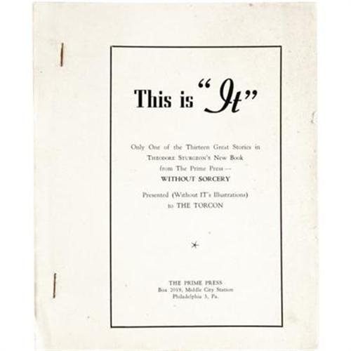 <B>Theodore Sturgeon: <I>This is "It"</B></I>.</B></I> (Philadelphia: Prime Press, 1948 ), 29 leaves on proof paper, printed on rectos only, self wrappers, stapled, 12mo (6" x 7.5"). Minor edge wear, mild spotting to the front cover, and minimal rusting around the staples, else in near fine condition. Issued in advance of <I>Without Sorcery</B></I> as a promotion and distributed at the 1948 World Science Fiction Convention (TORCON). It is thought that only 50 copies were printed.<BR><BR><b>Shipping:</b> Books & Catalogs (<a target="_blank" href="http://www.heritageauctions.com/common/shipping.php">view shipping information</a>)