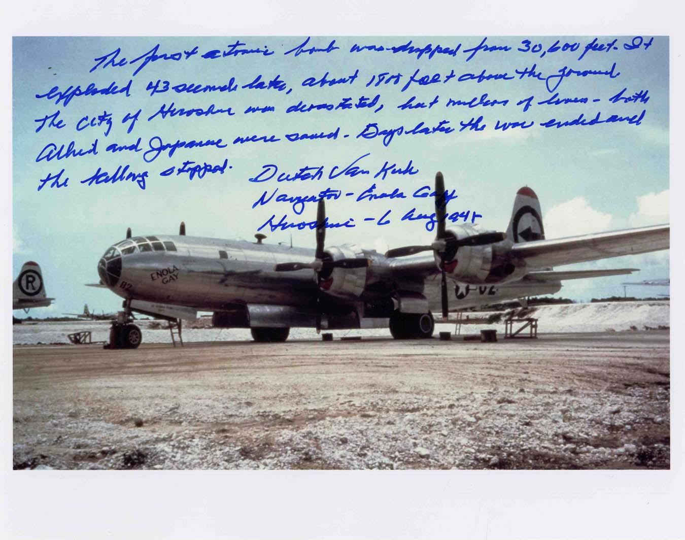 Theodore ''Dutch'' Van Kirk lengthy notation upon a photograph of the Enola Gay. Van Kirk writes in blue marker at the top: ''The first atomic bomb was dropped from 30,600 ft. It exploded 43 seconds late, about 1800 feet above the ground. The city of Hiroshima was devastated, but millions of lives - both Allied and Japanese were saved. Days later the war ended and the killing stopped. Dutch Van Kirk / Navigator - Enola Gay / Hiroshima - 6 Aug. 1945''. Colorful 10'' x 8'' satin-finish photo is in fine condition.