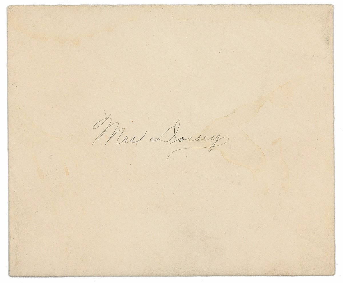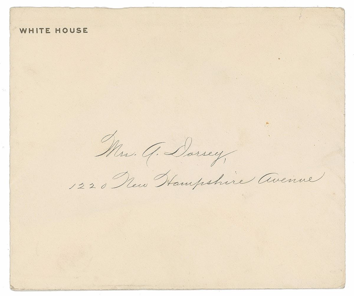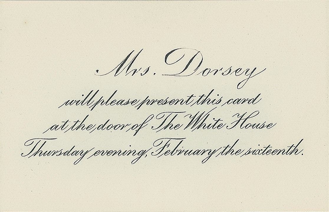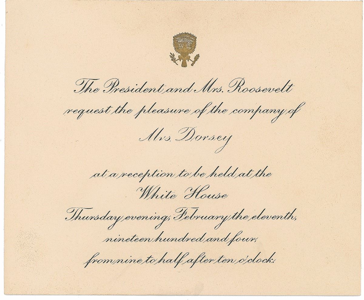 Partly-printed invitation filled out in another hand, unsigned, one page, 5.75 x 4.75, February 11, 1904. In part: “The President and Mrs. Roosevelt request the pleasure of the company of Mrs. Dorsey at a reception to be held at the White House.” Includes the White House guest admission ticket. In fine condition. Accompanied by the original transmittal envelope.