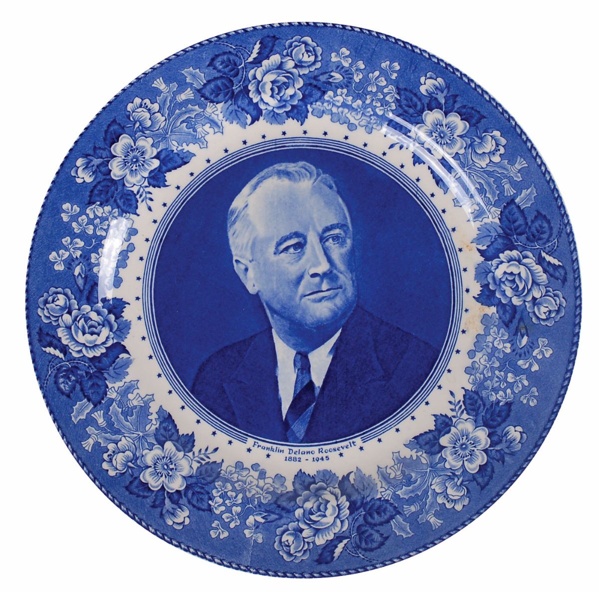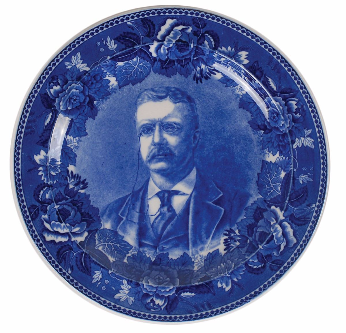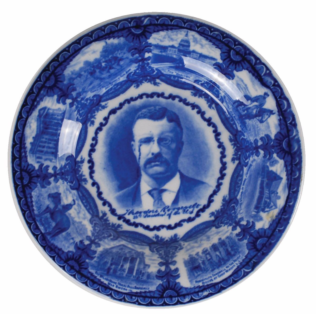 Collection of three white-and-blue plates, measuring between 9? and 10? in diameter, including: one Wedgewood transferware plate depicting Theodore Roosevelt, with an excerpt of an address given at the 1903 Syracuse State Fair on the reverse; one flow blue ceramic plate depicting Theodore Roosevelt; and one Old English Staffordshire transferware plate depicting Franklin D. Roosevelt. In overall fine condition.