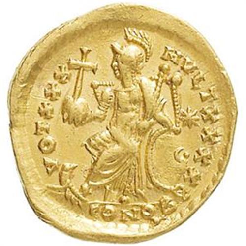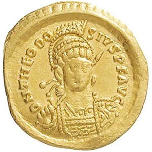 Roman Empire Coins. Theodosius II (402-450). Solido, Constantinople. D/ DN THEODOSIVS PF AVG. Busto armato stante tre quarti a destra. R/ VOT XXX MVLT XXXX B. Constantinople seduta a sinistra, con piede su prua, tiene globo crucigero e scettro. In esergo: CONOB. LRC 379. gr. 3.98 AU. Bel BB+.