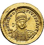 Theodosius II (402-450). Solidus, Constantinople. Obv. DN THEODOSIVS PF AVG. Armoured, diademed and helmeted bust three-quarter facing, spear in right hand and shield on left shoulder. Rev. VOT XXX MVLT XXXX. Constantinopolis enthroned left, holding globus cruciger in right hand and long scepter in left, left foot on prow, and shield by Ieft side; star in right field; CONOB in exergue. LRC 379 var. AU. g. 4.52 mm. 20.00 An imperceptible graffito in right field on obverse and some encrustation on reverse, otherwise Good EF. Impero Romano. LRC 379 var. AU. g. 4.52 mm. 20.00