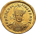 Theodosius II (402-450). Solidus, Thessalonica. Rev. CLOR ORVIS TERRAR. Emperor standing facing, in military costume, holding labarum and globus cruciger; star in left field; TESOB in exergue. LRC 364. AU. g. 4.32 mm. 21.00 An almost invisible graffito in reverse field, otherwise Good EF/Almost FDC. Brilliant and superb. Impero Romano. D/ DN THEODOSIVS PF AVG. Helmeted and cuirassed bust three-quarter facing right, holding spear and shield. LRC 364. AU. g. 4.32 mm. 21.00
