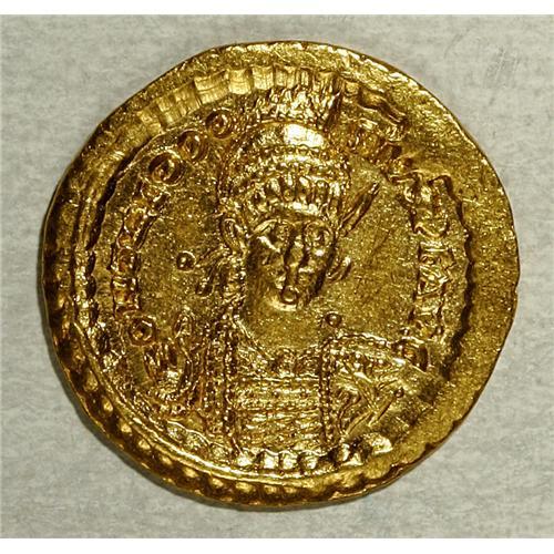 <B>Theodosius II.</B></I> A.D. 402-450. AV solidus (20 mm, 4.46 g). Constantinople, A.D. 430-439. Diademed, helmeted, and cuirassed bust facing slightly right, holding spear and shield decorated with horseman motif / Constantinopolis seated left, foot on prow, holding globus cruciger and sceptre; shield at her side, star to right; (Delta)/CONOB. RIC 257; Depeyrot 81/1. <B>EF.</B></I><BR><BR><b>Shipping:</b> Coin/Currency (<a target="_blank" href="http://www.heritageauctions.com/common/shipping.php">view shipping information</a>)