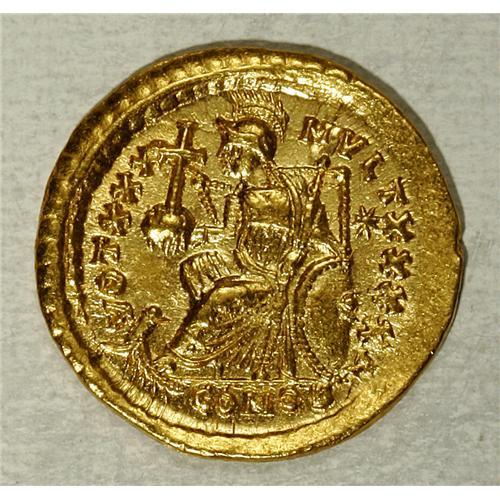 <B>Theodosius II.</B></I> A.D. 402-450. AV solidus (20 mm, 4.46 g). Constantinople, A.D. 430-439. Diademed, helmeted, and cuirassed bust facing slightly right, holding spear and shield decorated with horseman motif / Constantinopolis seated left, foot on prow, holding globus cruciger and sceptre; shield at her side, star to right; (Delta)/CONOB. RIC 257; Depeyrot 81/1. <B>EF.</B></I><BR><BR><b>Shipping:</b> Coin/Currency (<a target="_blank" href="http://www.heritageauctions.com/common/shipping.php">view shipping information</a>)