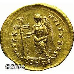 <B>Theodosius II.</B></I> A.D. 408-450. AV solidus (22 mm, 4.24 g). Constantinople, A.D. 420-422. Diademed, helmeted and cuirassed bust facing slightly right, holding spear and shield decorated with a horseman spearing fallen enemy / Victory standing left, holding long voided cross; (Gamma)/CONOB. RIC 219; Depeyrot 74/2. lustrous, Superb XF. <BR><I>From the Geneva Collection.</B></I> <BR><BR><B>Important notice:</B> Heritage usually auctions material at the rate of 200-250 lots per hour. On some occasions eBay Live bid software or the Internet may not be able to keep up with the pace of the auction. We recommend placing a realistic absentee bid now as insurance to avoid disappointment. Occasionally the auctioneer may eliminate or reject an eBay Live bid, and the auctioneer may also reopen a lot after the close of the eBay live bidding (usually because we missed an audience bid), and may reject your bid even if it shows you as the winning bidder. By bidding via eBay Live, you agree that Heritage may award the lot to another bidder at its sole discretion under the circumstances described above or any other reasonable circumstances. Since eBay bids are not shown to us until we open the lot on the floor, we treat those bids just like floor bids. In most cases the floor responds before the eBay bid is presented to us, due to Internet lag time, so for consistency we have made it a policy that floor bids are always considered first over tie eBay live bids. Also please note that all Heritage lots purchased through eBay Live carry a 20% Buyer's Premium. Please make sure you read the Terms and Conditions before you bid.