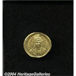 <B>Theodosius II.</B></I> A.D. 408-450. AV solidus (22 mm, 4.24 g). Constantinople, A.D. 420-422. Diademed, helmeted and cuirassed bust facing slightly right, holding spear and shield decorated with a horseman spearing fallen enemy / Victory standing left, holding long voided cross; (Gamma)/CONOB. RIC 219; Depeyrot 74/2. lustrous, Superb XF. <BR><I>From the Geneva Collection.</B></I> <BR><BR><B>Important notice:</B> Heritage usually auctions material at the rate of 200-250 lots per hour. On some occasions eBay Live bid software or the Internet may not be able to keep up with the pace of the auction. We recommend placing a realistic absentee bid now as insurance to avoid disappointment. Occasionally the auctioneer may eliminate or reject an eBay Live bid, and the auctioneer may also reopen a lot after the close of the eBay live bidding (usually because we missed an audience bid), and may reject your bid even if it shows you as the winning bidder. By bidding via eBay Live, you agree that Heritage may award the lot to another bidder at its sole discretion under the circumstances described above or any other reasonable circumstances. Since eBay bids are not shown to us until we open the lot on the floor, we treat those bids just like floor bids. In most cases the floor responds before the eBay bid is presented to us, due to Internet lag time, so for consistency we have made it a policy that floor bids are always considered first over tie eBay live bids. Also please note that all Heritage lots purchased through eBay Live carry a 20% Buyer's Premium. Please make sure you read the Terms and Conditions before you bid.