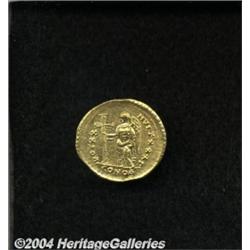 <B>Theodosius II.</B></I> A.D. 408-450. AV solidus (22 mm, 4.24 g). Constantinople, A.D. 420-422. Diademed, helmeted and cuirassed bust facing slightly right, holding spear and shield decorated with a horseman spearing fallen enemy / Victory standing left, holding long voided cross; (Gamma)/CONOB. RIC 219; Depeyrot 74/2. lustrous, Superb XF. <BR><I>From the Geneva Collection.</B></I> <BR><BR><B>Important notice:</B> Heritage usually auctions material at the rate of 200-250 lots per hour. On some occasions eBay Live bid software or the Internet may not be able to keep up with the pace of the auction. We recommend placing a realistic absentee bid now as insurance to avoid disappointment. Occasionally the auctioneer may eliminate or reject an eBay Live bid, and the auctioneer may also reopen a lot after the close of the eBay live bidding (usually because we missed an audience bid), and may reject your bid even if it shows you as the winning bidder. By bidding via eBay Live, you agree that Heritage may award the lot to another bidder at its sole discretion under the circumstances described above or any other reasonable circumstances. Since eBay bids are not shown to us until we open the lot on the floor, we treat those bids just like floor bids. In most cases the floor responds before the eBay bid is presented to us, due to Internet lag time, so for consistency we have made it a policy that floor bids are always considered first over tie eBay live bids. Also please note that all Heritage lots purchased through eBay Live carry a 20% Buyer's Premium. Please make sure you read the Terms and Conditions before you bid.
