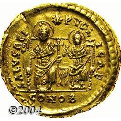 <B>Theodosius II.</B></I> A.D. 408-450. AV solidus (21 mm, 4.40 g). Constantinople, A.D. 425-429. Diademed, helmeted and cuirassed bust facing slightly right, holding spear and shield decorated with a horseman spearing fallen enemy / Theodosius II and Valentinian III seated facing, both nimbate, each holding mappa and cruciform sceptre; star above; CONOB. RIC 240; Depeyrot 79/1. VF. <BR><I>From the Geneva Collection.</B></I> <BR><BR><B>Important notice:</B> Heritage usually auctions material at the rate of 200-250 lots per hour. On some occasions eBay Live bid software or the Internet may not be able to keep up with the pace of the auction. We recommend placing a realistic absentee bid now as insurance to avoid disappointment. Occasionally the auctioneer may eliminate or reject an eBay Live bid, and the auctioneer may also reopen a lot after the close of the eBay live bidding (usually because we missed an audience bid), and may reject your bid even if it shows you as the winning bidder. By bidding via eBay Live, you agree that Heritage may award the lot to another bidder at its sole discretion under the circumstances described above or any other reasonable circumstances. Since eBay bids are not shown to us until we open the lot on the floor, we treat those bids just like floor bids. In most cases the floor responds before the eBay bid is presented to us, due to Internet lag time, so for consistency we have made it a policy that floor bids are always considered first over tie eBay live bids. Also please note that all Heritage lots purchased through eBay Live carry a 20% Buyer's Premium. Please make sure you read the Terms and Conditions before you bid.
