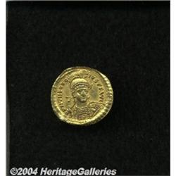 <B>Theodosius II.</B></I> A.D. 408-450. AV solidus (21 mm, 4.40 g). Constantinople, A.D. 425-429. Diademed, helmeted and cuirassed bust facing slightly right, holding spear and shield decorated with a horseman spearing fallen enemy / Theodosius II and Valentinian III seated facing, both nimbate, each holding mappa and cruciform sceptre; star above; CONOB. RIC 240; Depeyrot 79/1. VF. <BR><I>From the Geneva Collection.</B></I> <BR><BR><B>Important notice:</B> Heritage usually auctions material at the rate of 200-250 lots per hour. On some occasions eBay Live bid software or the Internet may not be able to keep up with the pace of the auction. We recommend placing a realistic absentee bid now as insurance to avoid disappointment. Occasionally the auctioneer may eliminate or reject an eBay Live bid, and the auctioneer may also reopen a lot after the close of the eBay live bidding (usually because we missed an audience bid), and may reject your bid even if it shows you as the winning bidder. By bidding via eBay Live, you agree that Heritage may award the lot to another bidder at its sole discretion under the circumstances described above or any other reasonable circumstances. Since eBay bids are not shown to us until we open the lot on the floor, we treat those bids just like floor bids. In most cases the floor responds before the eBay bid is presented to us, due to Internet lag time, so for consistency we have made it a policy that floor bids are always considered first over tie eBay live bids. Also please note that all Heritage lots purchased through eBay Live carry a 20% Buyer's Premium. Please make sure you read the Terms and Conditions before you bid.