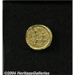 <B>Theodosius II.</B></I> A.D. 408-450. AV solidus (21 mm, 4.40 g). Constantinople, A.D. 425-429. Diademed, helmeted and cuirassed bust facing slightly right, holding spear and shield decorated with a horseman spearing fallen enemy / Theodosius II and Valentinian III seated facing, both nimbate, each holding mappa and cruciform sceptre; star above; CONOB. RIC 240; Depeyrot 79/1. VF. <BR><I>From the Geneva Collection.</B></I> <BR><BR><B>Important notice:</B> Heritage usually auctions material at the rate of 200-250 lots per hour. On some occasions eBay Live bid software or the Internet may not be able to keep up with the pace of the auction. We recommend placing a realistic absentee bid now as insurance to avoid disappointment. Occasionally the auctioneer may eliminate or reject an eBay Live bid, and the auctioneer may also reopen a lot after the close of the eBay live bidding (usually because we missed an audience bid), and may reject your bid even if it shows you as the winning bidder. By bidding via eBay Live, you agree that Heritage may award the lot to another bidder at its sole discretion under the circumstances described above or any other reasonable circumstances. Since eBay bids are not shown to us until we open the lot on the floor, we treat those bids just like floor bids. In most cases the floor responds before the eBay bid is presented to us, due to Internet lag time, so for consistency we have made it a policy that floor bids are always considered first over tie eBay live bids. Also please note that all Heritage lots purchased through eBay Live carry a 20% Buyer's Premium. Please make sure you read the Terms and Conditions before you bid.