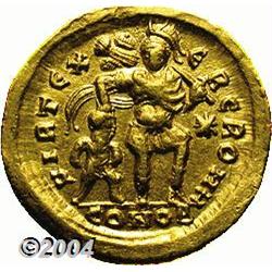 <B>Theodosius II.</B></I> A.D. 408-450. AV solidus (20 mm, 4.44 g). Constantinople, A.D. 441. Diademed, helmeted and cuirassed bust facing slightly right, holding spear and shield decorated with a horseman spearing fallen enemy / Helmeted warrior advancing right, head turned left, dragging captive by the hair and carrying trophy; star in right field; H/CONOB. RIC 284; Depeyrot 83/1. Good VF. Rare type. <BR><I>From the Geneva Collection.</B></I> <BR><BR><B>Important notice:</B> Heritage usually auctions material at the rate of 200-250 lots per hour. On some occasions eBay Live bid software or the Internet may not be able to keep up with the pace of the auction. We recommend placing a realistic absentee bid now as insurance to avoid disappointment. Occasionally the auctioneer may eliminate or reject an eBay Live bid, and the auctioneer may also reopen a lot after the close of the eBay live bidding (usually because we missed an audience bid), and may reject your bid even if it shows you as the winning bidder. By bidding via eBay Live, you agree that Heritage may award the lot to another bidder at its sole discretion under the circumstances described above or any other reasonable circumstances. Since eBay bids are not shown to us until we open the lot on the floor, we treat those bids just like floor bids. In most cases the floor responds before the eBay bid is presented to us, due to Internet lag time, so for consistency we have made it a policy that floor bids are always considered first over tie eBay live bids. Also please note that all Heritage lots purchased through eBay Live carry a 20% Buyer's Premium. Please make sure you read the Terms and Conditions before you bid.