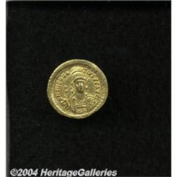 <B>Theodosius II.</B></I> A.D. 408-450. AV solidus (20 mm, 4.44 g). Constantinople, A.D. 441. Diademed, helmeted and cuirassed bust facing slightly right, holding spear and shield decorated with a horseman spearing fallen enemy / Helmeted warrior advancing right, head turned left, dragging captive by the hair and carrying trophy; star in right field; H/CONOB. RIC 284; Depeyrot 83/1. Good VF. Rare type. <BR><I>From the Geneva Collection.</B></I> <BR><BR><B>Important notice:</B> Heritage usually auctions material at the rate of 200-250 lots per hour. On some occasions eBay Live bid software or the Internet may not be able to keep up with the pace of the auction. We recommend placing a realistic absentee bid now as insurance to avoid disappointment. Occasionally the auctioneer may eliminate or reject an eBay Live bid, and the auctioneer may also reopen a lot after the close of the eBay live bidding (usually because we missed an audience bid), and may reject your bid even if it shows you as the winning bidder. By bidding via eBay Live, you agree that Heritage may award the lot to another bidder at its sole discretion under the circumstances described above or any other reasonable circumstances. Since eBay bids are not shown to us until we open the lot on the floor, we treat those bids just like floor bids. In most cases the floor responds before the eBay bid is presented to us, due to Internet lag time, so for consistency we have made it a policy that floor bids are always considered first over tie eBay live bids. Also please note that all Heritage lots purchased through eBay Live carry a 20% Buyer's Premium. Please make sure you read the Terms and Conditions before you bid.