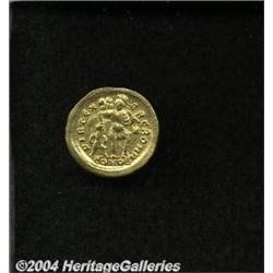 <B>Theodosius II.</B></I> A.D. 408-450. AV solidus (20 mm, 4.44 g). Constantinople, A.D. 441. Diademed, helmeted and cuirassed bust facing slightly right, holding spear and shield decorated with a horseman spearing fallen enemy / Helmeted warrior advancing right, head turned left, dragging captive by the hair and carrying trophy; star in right field; H/CONOB. RIC 284; Depeyrot 83/1. Good VF. Rare type. <BR><I>From the Geneva Collection.</B></I> <BR><BR><B>Important notice:</B> Heritage usually auctions material at the rate of 200-250 lots per hour. On some occasions eBay Live bid software or the Internet may not be able to keep up with the pace of the auction. We recommend placing a realistic absentee bid now as insurance to avoid disappointment. Occasionally the auctioneer may eliminate or reject an eBay Live bid, and the auctioneer may also reopen a lot after the close of the eBay live bidding (usually because we missed an audience bid), and may reject your bid even if it shows you as the winning bidder. By bidding via eBay Live, you agree that Heritage may award the lot to another bidder at its sole discretion under the circumstances described above or any other reasonable circumstances. Since eBay bids are not shown to us until we open the lot on the floor, we treat those bids just like floor bids. In most cases the floor responds before the eBay bid is presented to us, due to Internet lag time, so for consistency we have made it a policy that floor bids are always considered first over tie eBay live bids. Also please note that all Heritage lots purchased through eBay Live carry a 20% Buyer's Premium. Please make sure you read the Terms and Conditions before you bid.